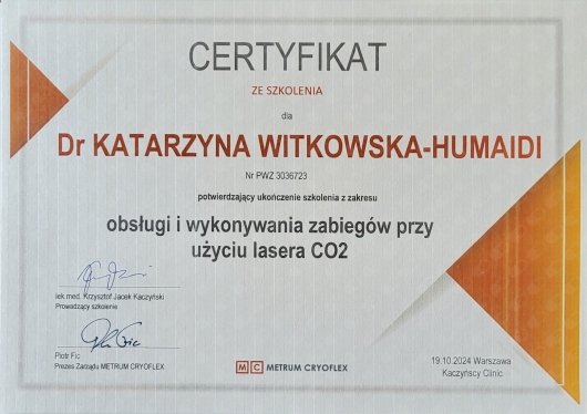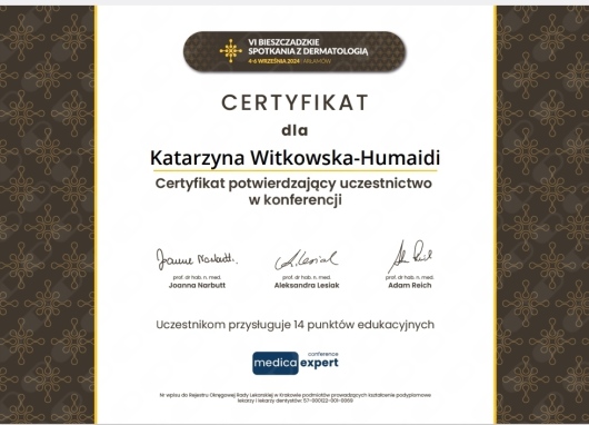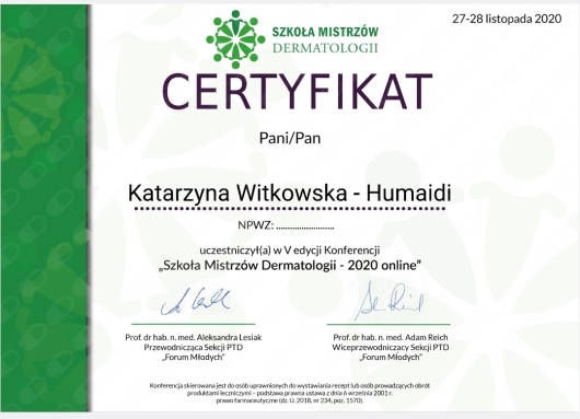 Lekarz Katarzyna Witkowska – Humaidi specjalista dermatolog – wenerolog. Zajmuje się diagnostyką i leczeniem chorób skórnych i wenerycznych, prowadzi również profilaktyczne badania dermatoskopowe znamion. Przyjmuje pacjentów w każdym wieku. Interesuje się schorzeniami skóry, a także poprawą jej wyglądu. Nieustannie pogłębia swoją wiedzę i umiejętności uczestnicząc w licznych konferencjach, sympozjach i szkoleniach poświęconych dermatologii, wenerologii oraz medycynie estetycznej. Członek Polskiego Towarzystwa Dermatologicznego.