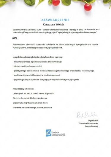 W Idealist dr Katarzyna udziela konsultacji z zakresu diabetologii oraz flebologii. Wykonuje także USG doppler kończyn żył kończyn dolnych. W przypadku wizyt pierwszorazowych prosimy o zabranie ze sobą wyników badań oraz o zgłoszenie się około 10 minut wcześniej. Z placówką Idealist można skontaktować się online lub telefonicznie.