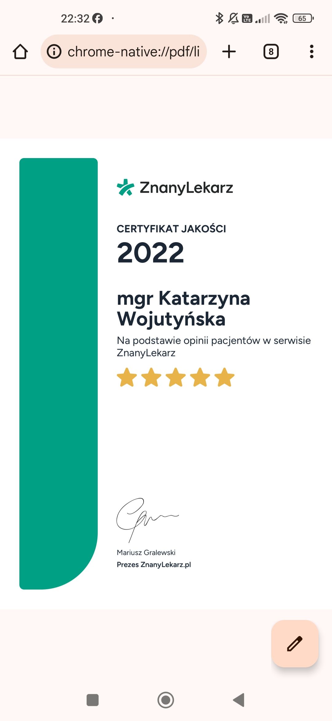 Konsultacja psychologiczna została przeprowadzona w sposób w pełni profesjonalny, z dużym wyczuciem i zrozumieniem potrzeb dziecka. Pani Psycholog wykazała się empatią, uważnością oraz umiejętnością nawiązania kontaktu z młodym pacjentem, co pozwoliło na uzyskanie rzetelnego obrazu sytuacji. Udzielone wskazówki były konkretne, trafne i bardzo pomocne. Z pełnym przekonaniem rekomenduję współpracę z Panią Psycholog a Pani Psycholog gratuluję wyboru zawodu bo wykonuje świetna prace :-)