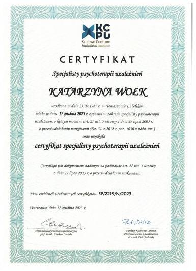 Jako specjalista psychoterapii uzależnień udzielam wsparcia w diagnozie, leczeniu i profilaktyce uzależnień. Certyfikat specjalisty psychoterapii uzależnień uzyskałam zdając państwowy egzamin organizowany przez Krajowe Centrum Profilaktyki Uzależnień. Pracując z młodzieżą i dorosłymi uzależnionymi od substancji psychoaktywnych oraz uzależnionymi behawioralnie, kładę nacisk na partnerstwo w terapii oraz wzmacnianie mocnych stron pacjenta stawiając na pierwszym miejscu długofalowe wsparcie w leczeniu.