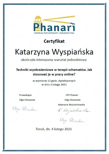 Jaki jest zakres porad oferowanych przez Katarzyna Wyspiańska?Katarzyna Wyspiańska to psychoterapeuta certyfikowany, psycholog. Na podstawie swojego doświadczenia i wykształcenia Katarzyna Wyspiańska oferuje usługi takie jak: psychoterapia indywidualna, Psychoterapia poznawczo-behawioralna, Psychoterapia, Konsultacja psychologiczna online, psychoterapia online, Kontynuacja terapii.
