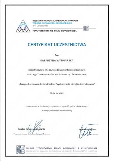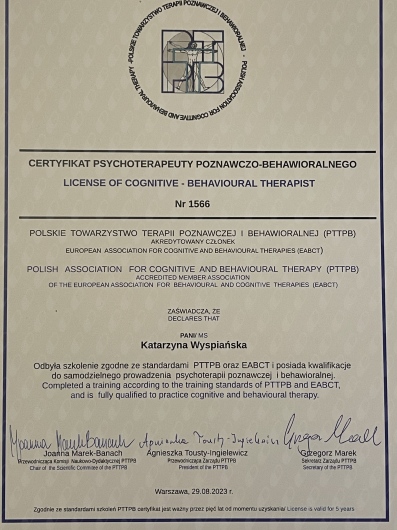 Pani Katarzyna jest wspaniałą specjalistką. Wykazuje się ogromną empatią, zrozumieniem, pamięta wątki i szczegóły z poprzednich sesji, jest bardzo zaangażowana. Rozpoczęłam psychoterapię w bardzo trudnym dla mnie okresie i mogłam liczyć na profesjonalne wsparcie psychoterapeutyczne. Pani Katarzyna ma szeroką wiedzę i wie, jak zarządzić procesem psychoterapeutycznym.
