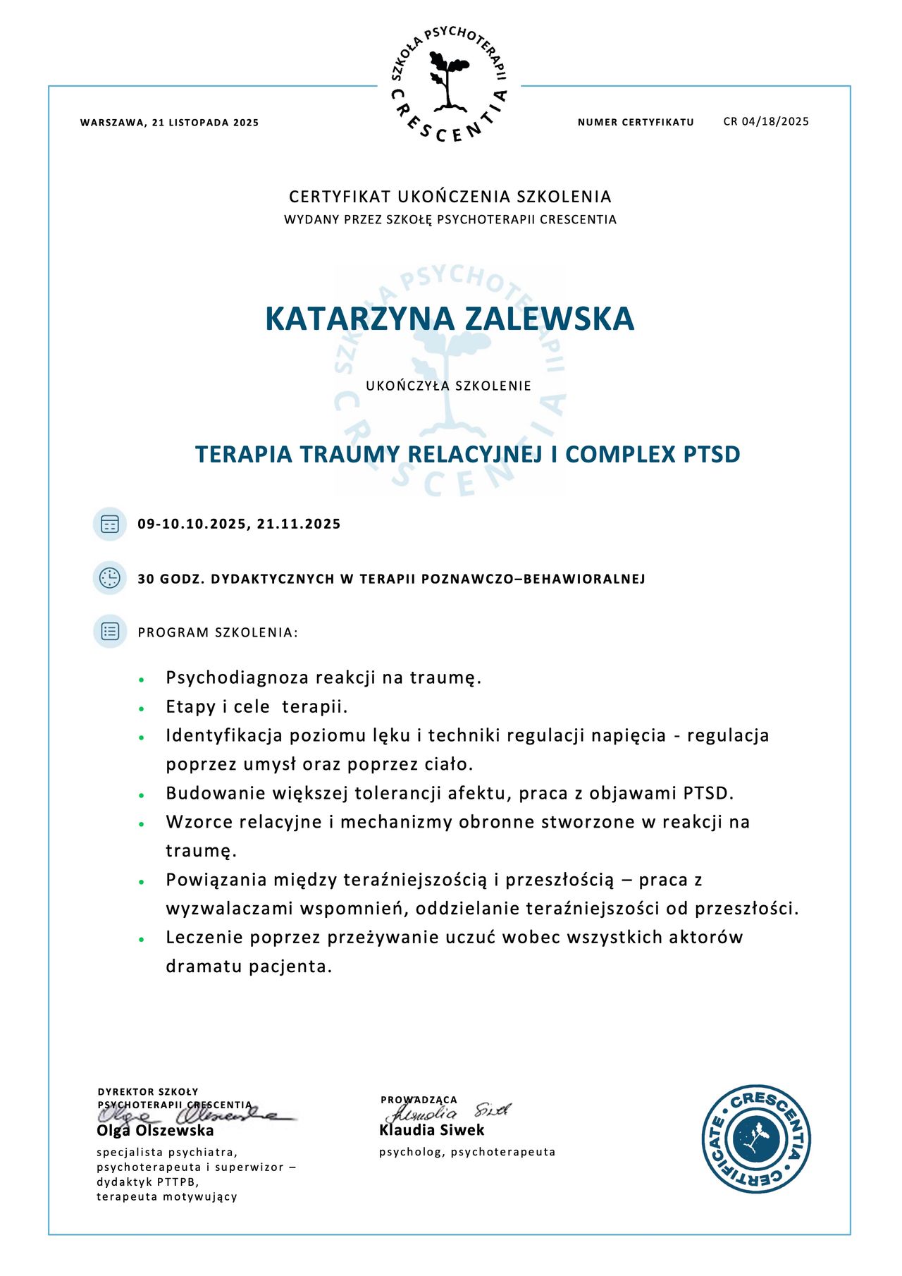 Obecnie jestem psychoterapeutką w trakcie certyfikacji w szkole Psychoterapii Crescentia. Jest to 4-letnie szkolenie w nurcie poznawczo-behawioralnym