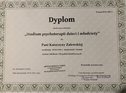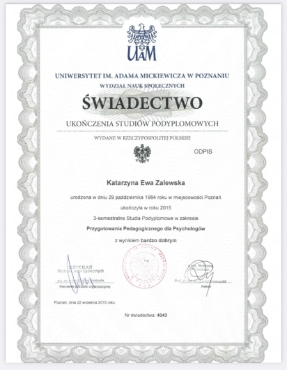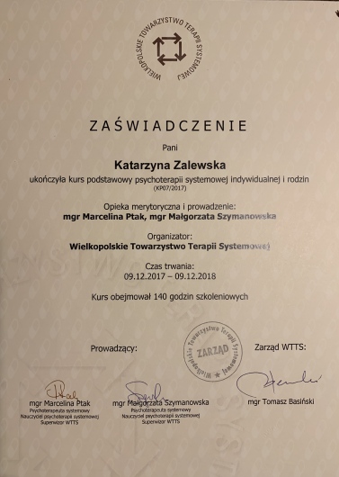 Ukończyłam Kurs Podstawowy Psychoterapii w Wielkopolskim Towarzystwie Terapii Systemowej, którego jestem członkiem nadzwyczajnym, a obecnie uczestniczę w Kursie Zaawansowanym Psychoterapii Systemowej. Ukończyłam także Studium Psychoterapii Dzieci i Młodzieży w nurcie poznawczo-behawioralnym oraz studia podyplomowe z przygotowania pedagogicznego dla psychologów. Regularnie biorę udział w szkoleniach i superwizjach, stale rozwijając swoje kompetencje.