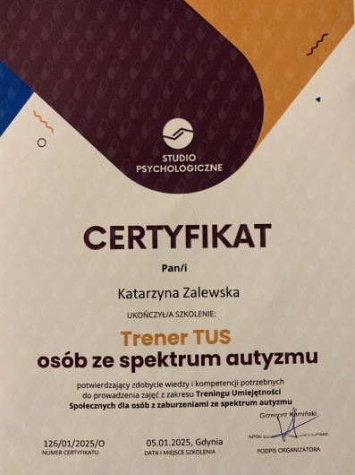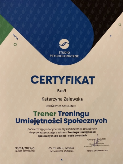 Jestem psychologiem, psychologiem dziecięcym oraz psychoterapeutą w trakcie certyfikacji. Posiadam również certyfikat trenera umiejętności społecznych (TUS).