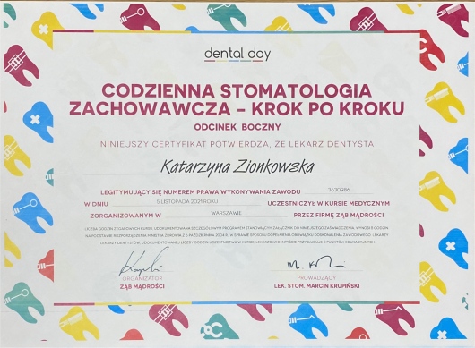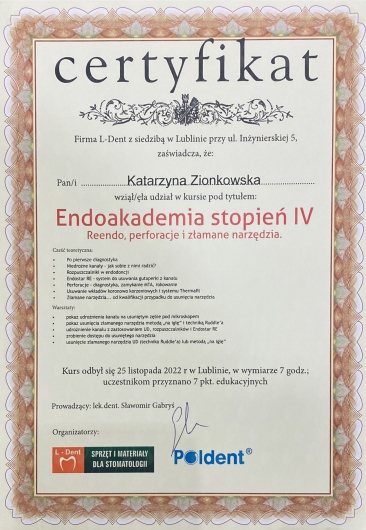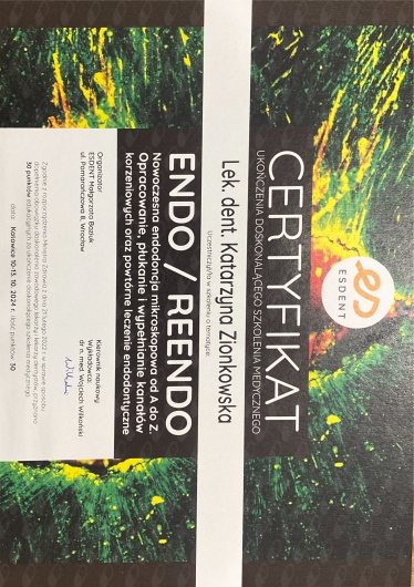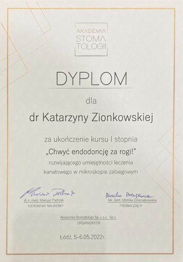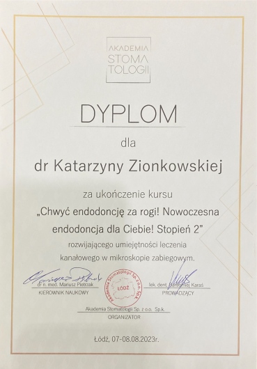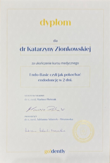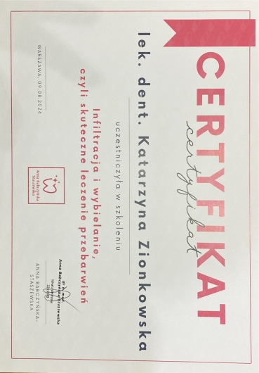 Pani Doktor Katarzyna Zionkowska, to bardzo dobry specjalista, zna się doskonale na tym co robi, nawet leczenie kanałowe u Doktor nie jest stresujące, wszystko szczegółowo tłumaczy i wyjaśnia. Polecam serdecznie .