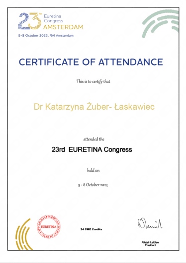 Jaki jest zakres porad oferowanych przez Katarzyna Żuber-Łaskawiec?Katarzyna Żuber-Łaskawiec to okulista. Na podstawie swojego doświadczenia i wykształcenia Katarzyna Żuber-Łaskawiec oferuje usługi takie jak: konsultacja okulistyczna, pachymetria, optyczna koherentna tomografia OCT – badanie jednego oka, badanie Angio-OCT, zdjęcie kolorowe dna oka lub przedniego odcinka (jedno oko), zdjęcie kolorowe dna oka lub przedniego odcinka (dwoje oczu), zdjęcie autofluorescencji dna oka (jedno oko), zdjęcie autofluorescencji dna oka (dwoje oczu), gonioskopia - badanie kąta przesączania, ciśnienie wewnątrzgałkowe.