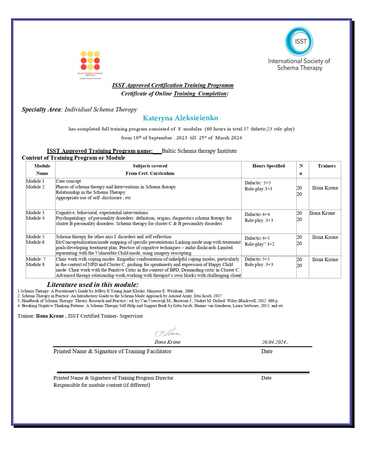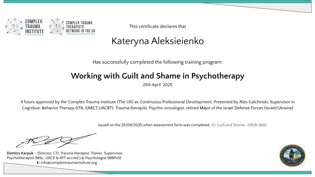Jaki jest zakres porad oferowanych przez Kateryna Aleksieienko?Kateryna Aleksieienko to psycholog. Na podstawie swojego doświadczenia i wykształcenia Kateryna Aleksieienko oferuje usługi takie jak: Konsultacja psychologiczna, konsultacja psychologiczna (kolejna wizyta), Konsultacja psychologiczna online, konsultacja psychologiczna (weekend), konsultacja terapeutyczna, konsultacja diagnostyczna, interwencja kryzysowa, Terapia indywidualna dla młodzieży od 16 roku życia- kolejna wizyta, Terapia indywidualna młodzieży od 16 roku życia - kolejna wizyta (online), konsultacja psychologiczna online - weekend.