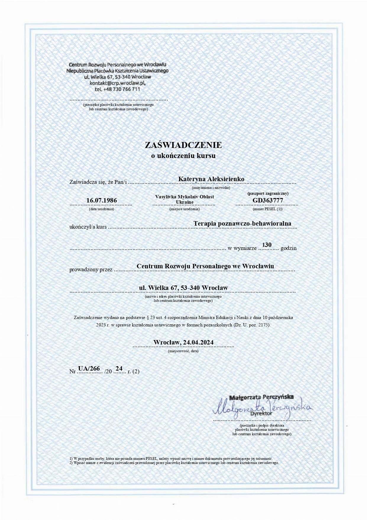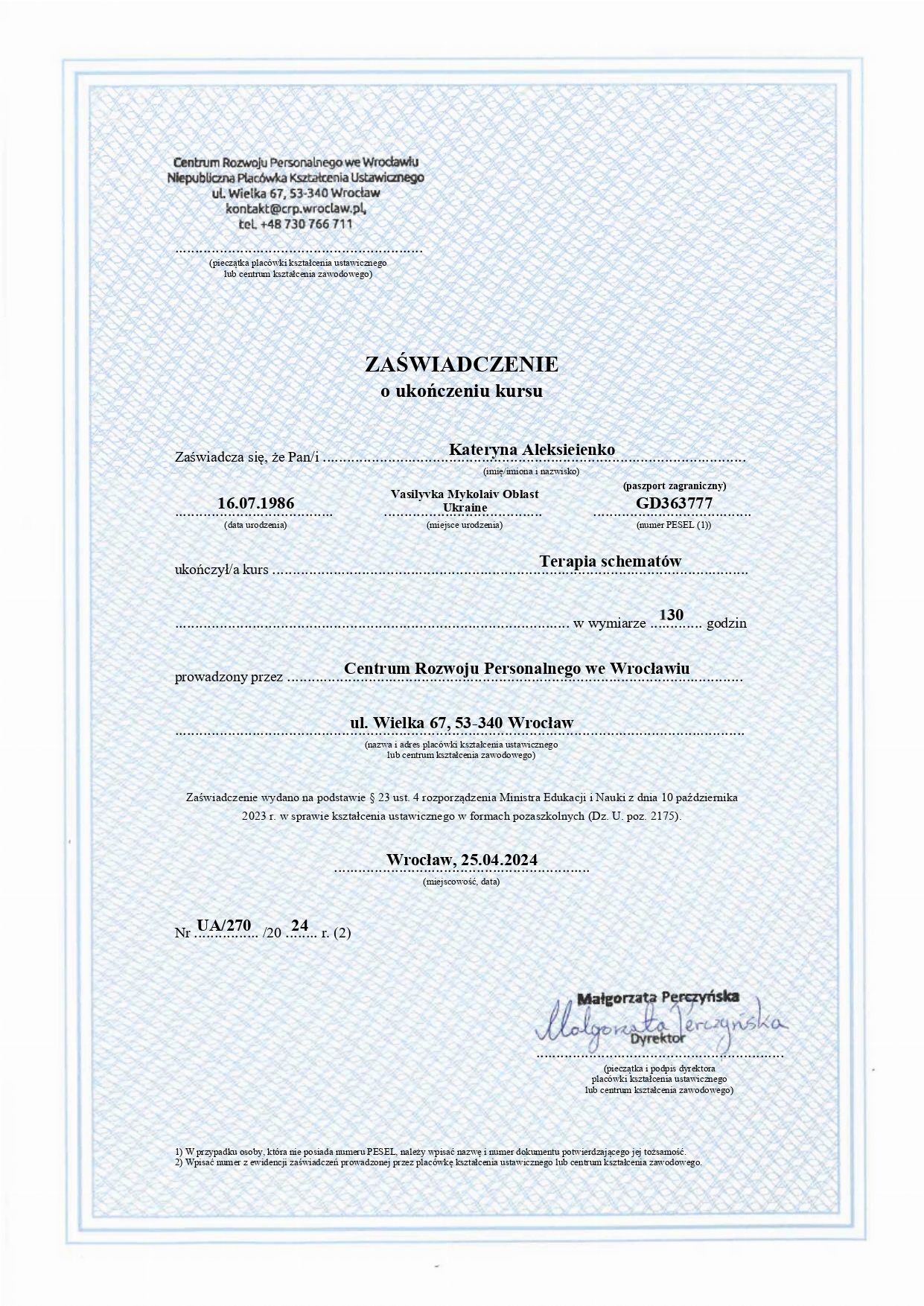Czy Kateryna Aleksieienko przyjmuje online, bez konieczności pojawiania się w placówce?Tak, Kateryna Aleksieienko oferuje konsultacje online. Wybierz opcję „konsultacja online” przy umawianiu wizyty, a zobaczysz dostępne terminy.