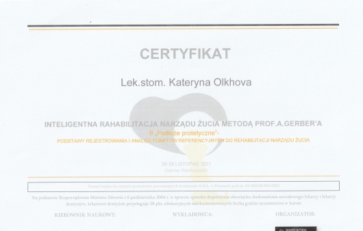 Jaki jest zakres porad oferowanych przez Kateryna Olkhova?Kateryna Olkhova to stomatolog. Na podstawie swojego doświadczenia i wykształcenia Kateryna Olkhova oferuje usługi takie jak: Konsultacja stomatologiczna, konsultacja protetyczna, wypełnienie kompozytowe.