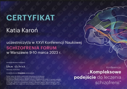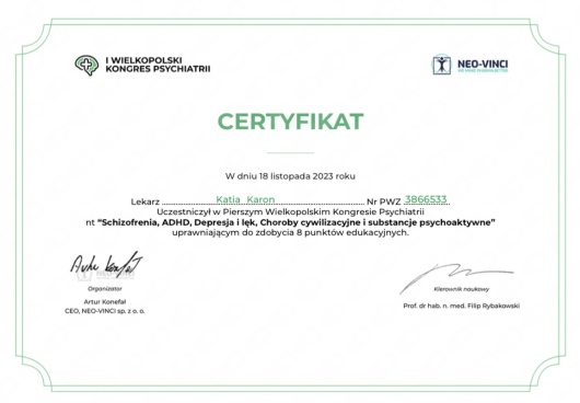 Jaki jest zakres porad oferowanych przez Katia Karoń?Katia Karoń to w trakcie specjalizacji (psychiatra). Na podstawie swojego doświadczenia i wykształcenia Katia Karoń oferuje usługi takie jak: konsultacja psychiatryczna (kolejna wizyta), konsultacja psychiatryczna (pierwsza wizyta), konsultacja psychiatryczna, Konsultacja psychiatryczna online (kolejna wizyta), e-recepta.