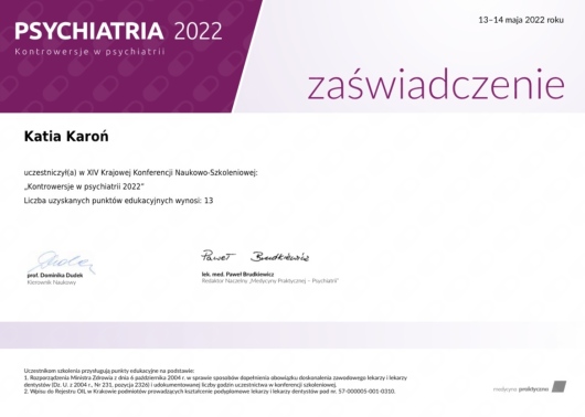 Jak Katia Karoń umawia wizyty?Katia Karoń używa kalendarza ZnanyLekarz, dlatego na stronie widzisz aktualne terminy. Wystarczy, że wybierzesz datę i godzinę, które odpowiadają Ci najbardziej. Umawianie wizyty jest darmowe, a tuż przed terminem wyślemy Ci przypomnienie.