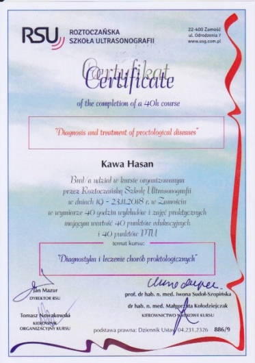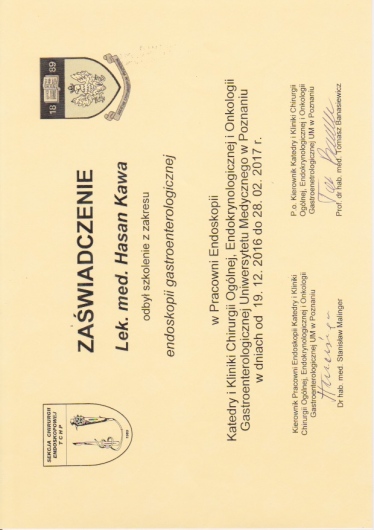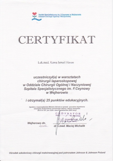 Specjalizację z Chirurgii Ogólnej odbyłem w latach 2004 - 2010 r. w Klinice Chirurgii Ogólnej, Leczenia Oparzeń i Chirurgii Plastycznej, gdzie uzyskałem tytuł Specjalisty Chirurgii Ogólnej z wynikiem bardzo dobrym (czwarty wynik testu w skali kraju).