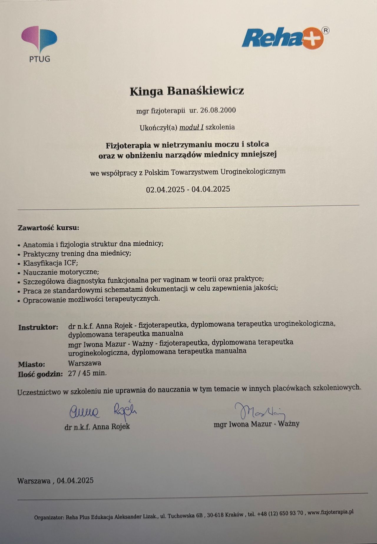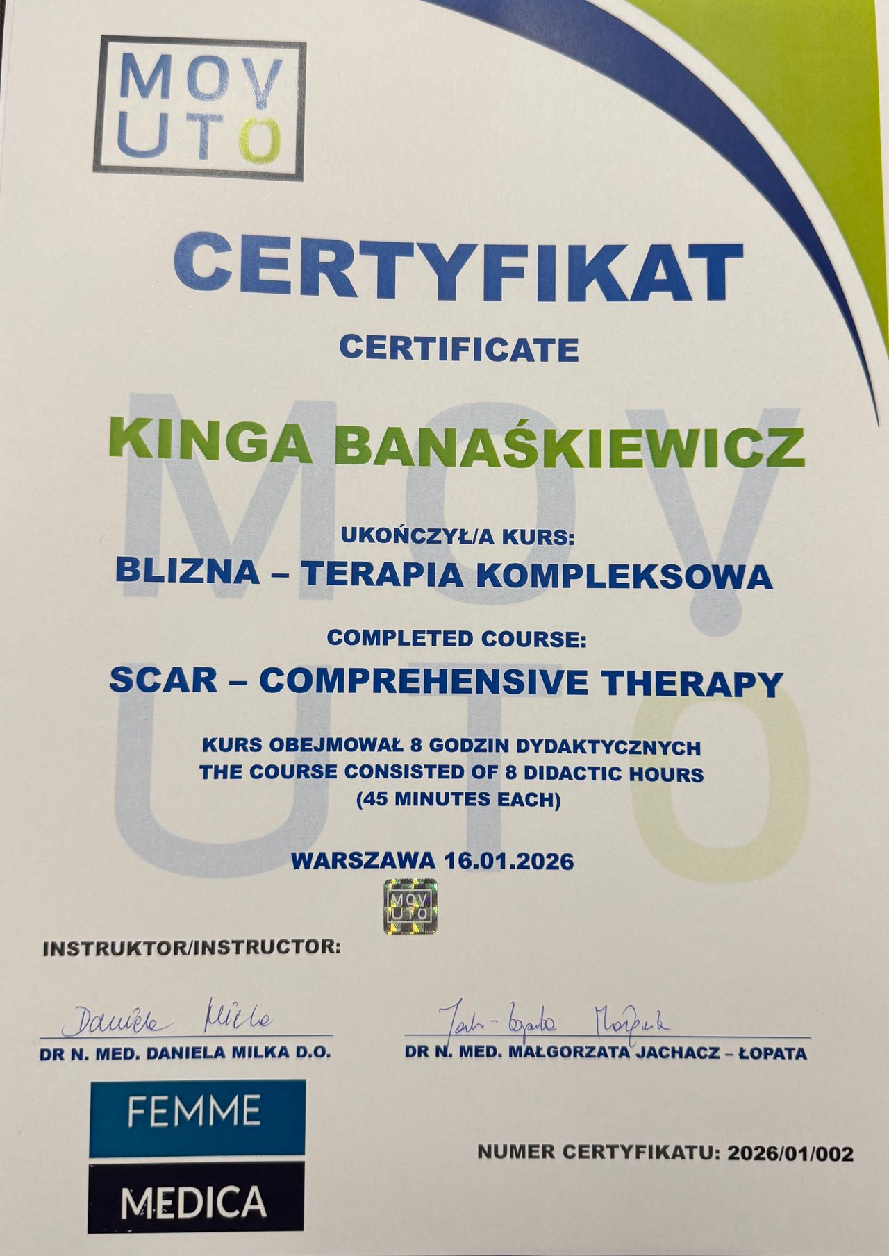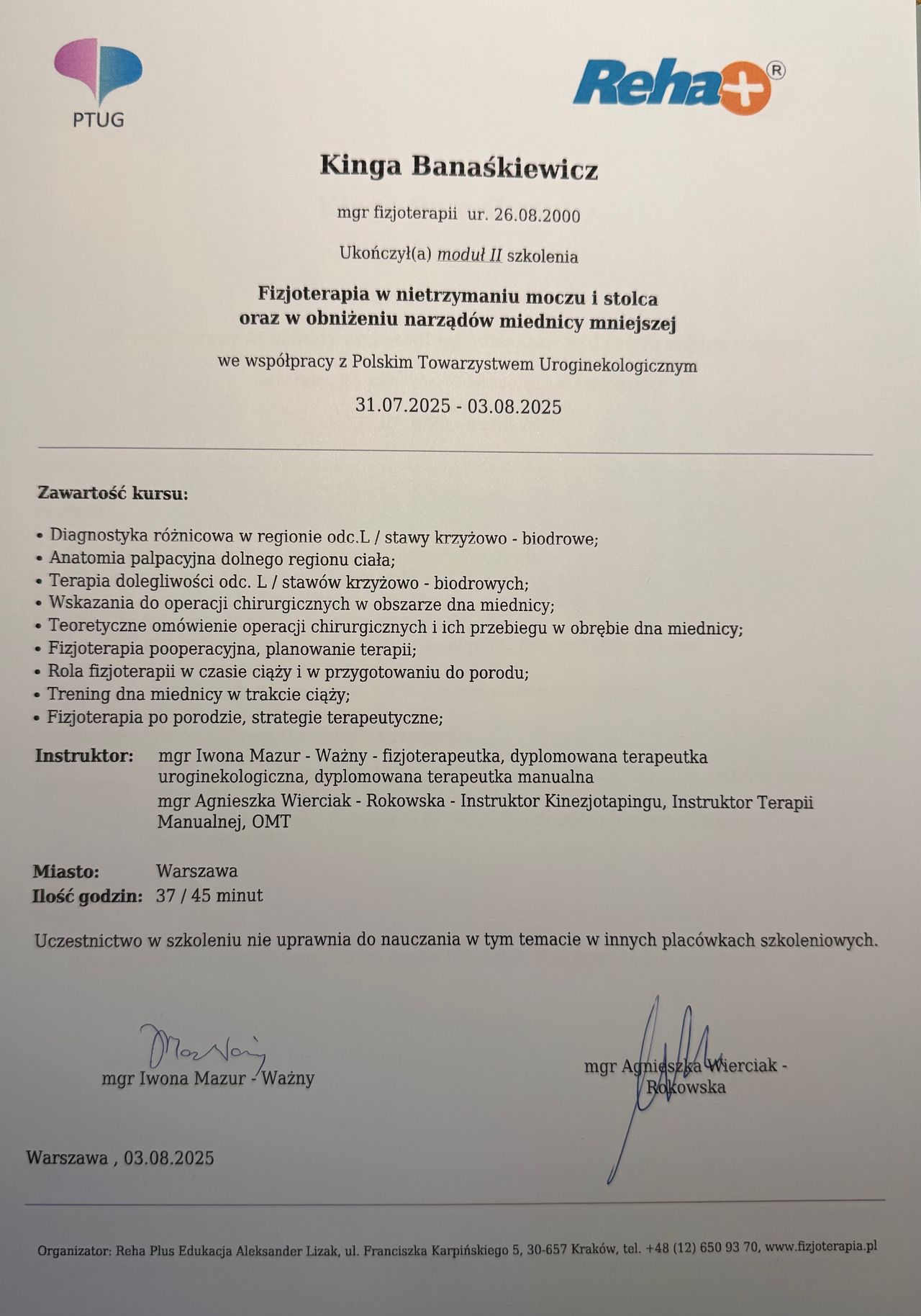 Jaki jest zakres porad oferowanych przez Kinga Banaśkiewicz?Kinga Banaśkiewicz to fizjoterapeuta. Na podstawie swojego doświadczenia i wykształcenia Kinga Banaśkiewicz oferuje usługi takie jak: fizjoterapia uroginekologiczna, INDIBA terapia, fizjoterapia kobiet w ciąży / fizjoterapia okołoporodowa, terapia blizn, kinesiotaping, przygotowanie do porodu, Fizjoterapia endometriozy, rehabilitacja onkologiczna, fizjoterapia estetyczna, Trening medyczny.