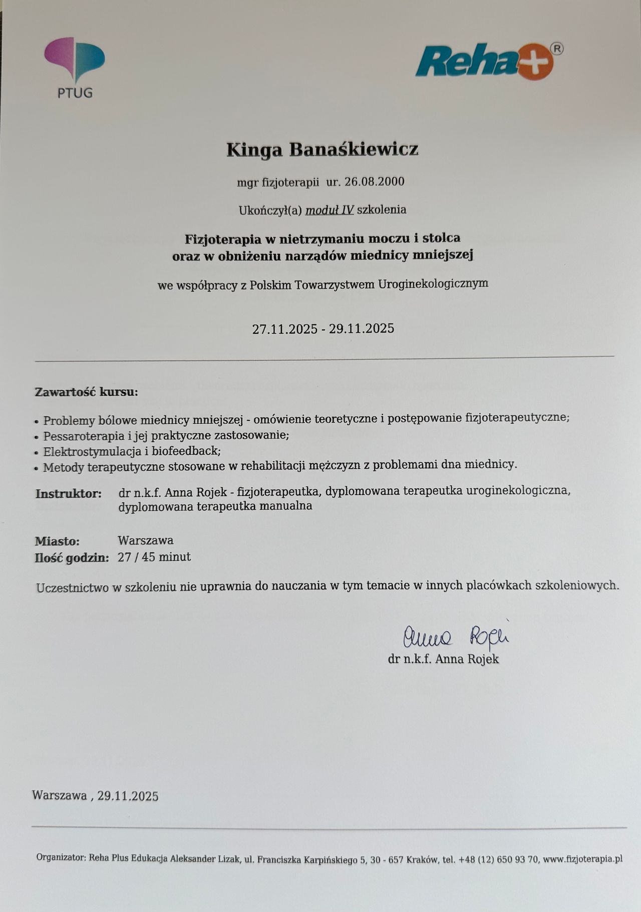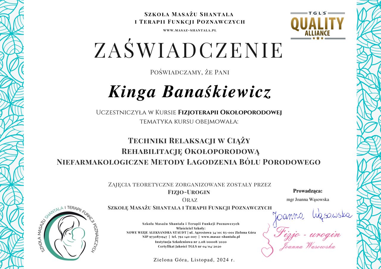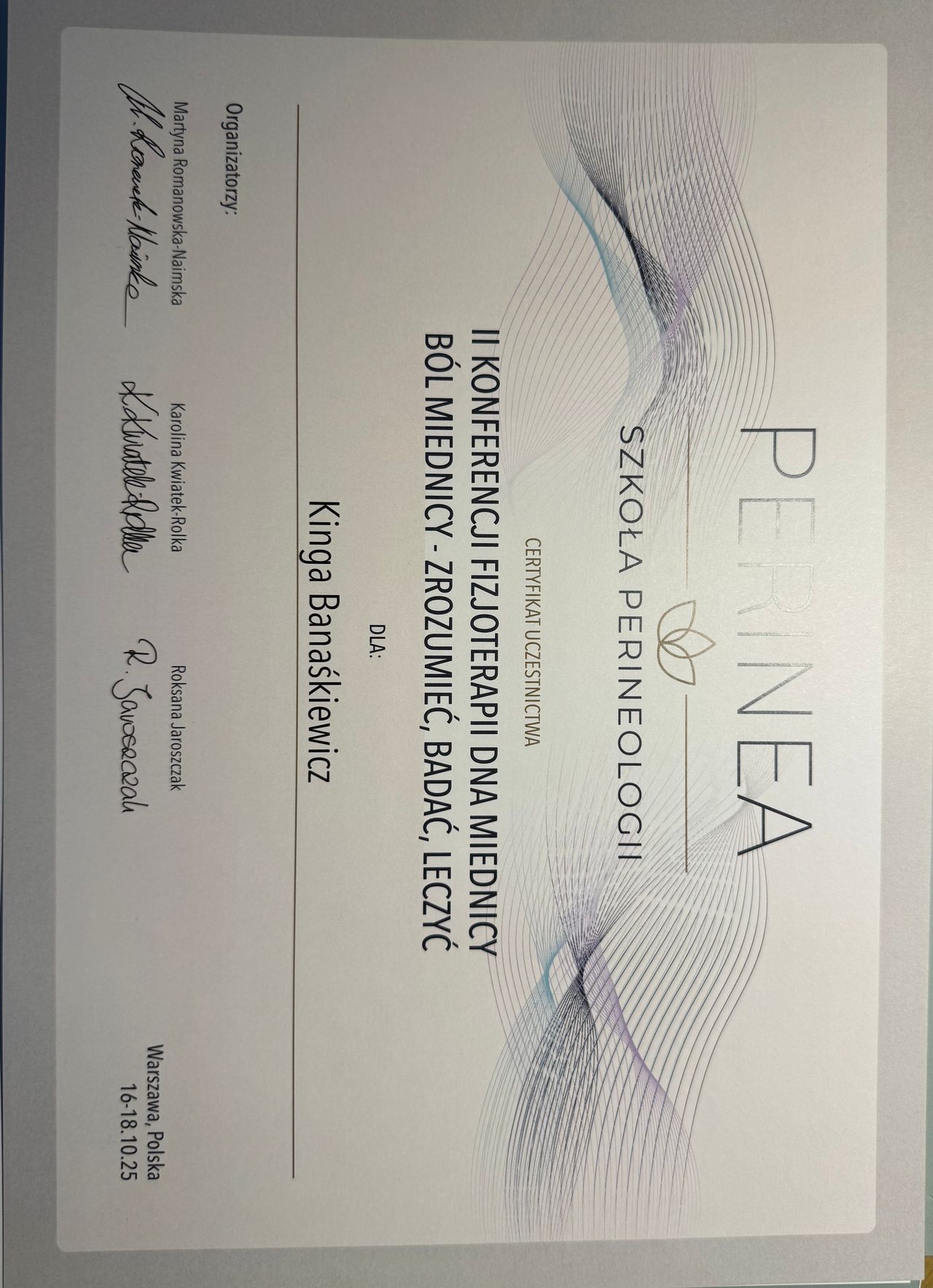 Jaki jest zakres porad oferowanych przez Kinga Banaśkiewicz?Kinga Banaśkiewicz to fizjoterapeuta. Na podstawie swojego doświadczenia i wykształcenia Kinga Banaśkiewicz oferuje usługi takie jak: fizjoterapia uroginekologiczna, INDIBA terapia, fizjoterapia kobiet w ciąży / fizjoterapia okołoporodowa, terapia blizn, kinesiotaping, przygotowanie do porodu, Fizjoterapia endometriozy, rehabilitacja onkologiczna, fizjoterapia estetyczna, Trening medyczny.