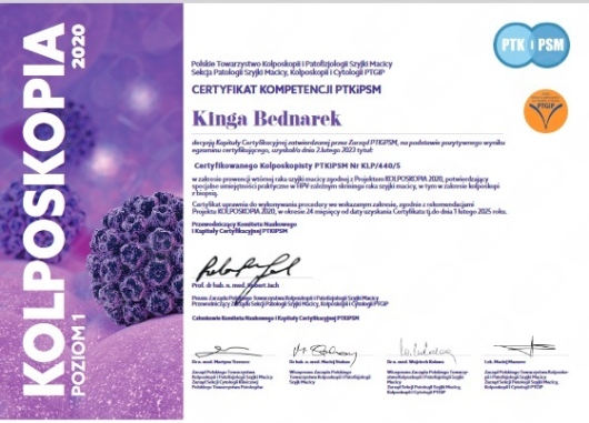 - Certyfikat Kompetencji PTKiPSM- certyfikowany kolposkopista