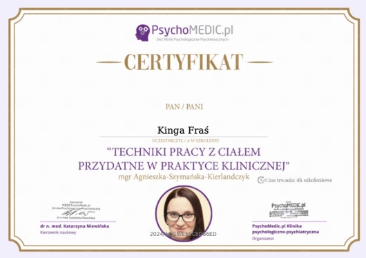 Pani Kinga jest psychologiem pełnym empatii i zaangażowania. Wykazuje dużo troski o pacjenta, dzięki czemu czuję się bezpiecznie podczas spotkań. Uważnie słucha i celnie podsumowuje moje wypowiedzi, co pozwala mi spojrzeć na problemy z innej strony. Profesjonalne podejście i wiedza Pani Kingi pomogły mi zrozumieć moje trudności, a moje samopoczucie poprawiło się już po kilku wizytach. Bardzo polecam!