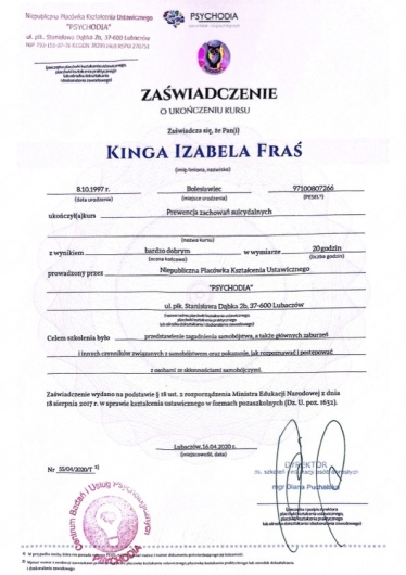 Pani Kinga jest niezwykle empatyczną i profesjonalną osobą, która potrafi stworzyć atmosferę bezpieczeństwa i zaufania. Już od pierwszych sesji czułam się na tyle swobodnie by móc poruszać trudne tematy. Pani Kinga zadaje niezwykle trafne pytania, które pozwalają zastanowić się nad prawdziwą istotą zachowań czy emocji. Zdecydowanie polecam p. Kinga Fraś wszystkim którzy szukają profesjonalnej pomocy psychologicznej, takiej która naprawdę pomaga.