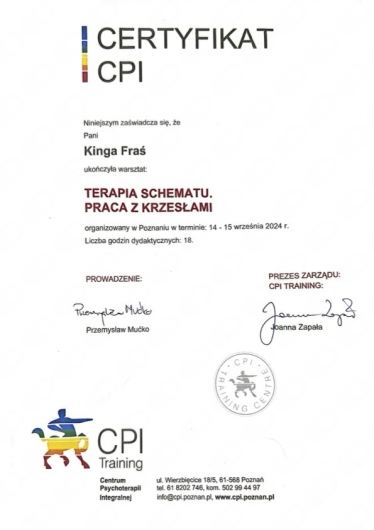 Pani Kinga jest bardzo profesjonalną, pełną empatii terapeutką. Potrafi dobrze wysłuchać, angażuje się bardzo w swoją pracę. Zadaje bardzo dużo pytań, które pozwalają na dokładne zbadanie sprawy i zmuszają do refleksji. Pani Kinga ma ogromną wiedzę i jest profesjonalistką w swojej dziedzinie. Dzięki niej można odkryć nowe, niezauważone wcześniej perspektywy spraw, które porusza się z nią na terapii. Bardzo polecam!