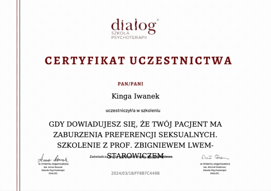 Zapraszam na szczerą rozmowę w atmosferze bezpieczeństwa, bez tematów tabu. Przyjmuję zarówno stacjonarnie, jak i online.