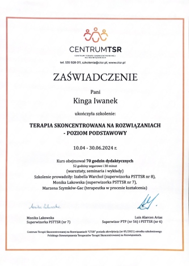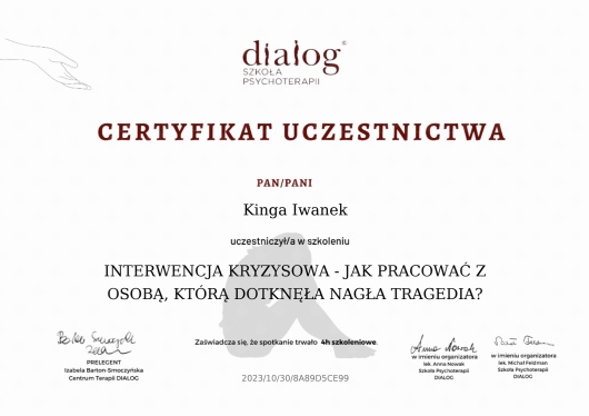 Uczestniczę także w szkoleniach podnoszących moje kompetencje, a swoje działania poddaję regularnej superwizji, co gwarantuje najwyższą jakość świadczonej pomocy.