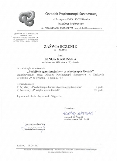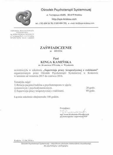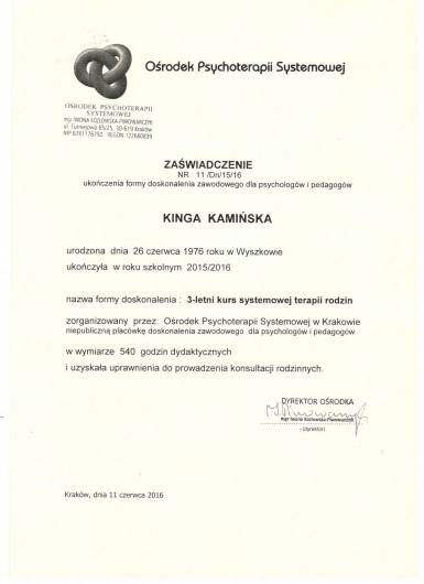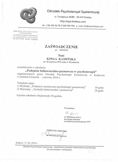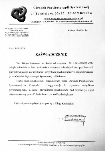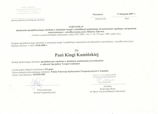 Ukończyłam Kurs psychoterapii systemowej w Krakowskim Ośrodku Psychoterapii Systemowej w 2017 roku. Od 2003 roku zajmuję się terapią osób uzależnionych od substancji psychoaktywnych, narkotyków,alkoholu, hazardu i internetu. Prowadzę terapię grupową oraz sesje terapii indywidualnej dla osób uzależnionych. Posiada Certyfikat uczestnictwa w warsztatach szkoleniowych poświęconych problematyce: "Stresów i optymalizacji relacji interpersonalnych". Świadectwo ukończenia kursu kwalifikacyjnego pedagogicznego. Certyfikaty uczestnictwa w szkoleniach realizowanych przez Zespół Szkoleniowy Polskiej Federacji Społeczności Terapeutycznych: - Diagnoza problemowa w uzależnieniach 48h. - Zaburzenia współwystępujące w uzależnieniach 20h. - Praca z rodziną uzależnionego 120h. - Wczesna interwencja terapeutyczna 48h. Kursy prowadzone przez Centrum Medyczne Kształcenia Podyplomowego pt: - "Diagnostyka seksuologiczna dla psychologów". - "Seksuologia sądowa". Roczne Studium Readaptacji Społecznej organizowane przez Towarzystwo Psychoprofilaktyczne. Pracuje w ośrodku terapii uzależnień w Wyszkowie jako specjalista terapii uzależnień oraz w prywatnie prowadzę praktykę psychoterapeutyczną jako psychoterapeuta systemowy. Zajmuje się problematyką pomocy osobom we wprowadzaniu ważnych dla nich zmian w życiu rodzinnym oraz osobistym. Jeśli znalazłeś/aś się tutaj to znaczy że potrzebujesz pomocy. Wtedy kiedy jej potrzebujemy jesteśmy w jakiś sposób bardziej podatni na zranienia. Nie musisz się obawiać że się odsłonisz, jestem osobą otwartą na świat i ludzi z całym bagażem doświadczeń i ze wszystkim kim są. Nie musisz się obawiać się oceny i odrzucenia, każdy może być inny – wszyscy są wyjątkowy. Osoby z jakiś przyczyn ustawiające się poza czy to systemem, normą, punktem odniesienia są mile widziane, te spełniające normy też. Jestem psychoterapeutką lgbt friendly, osobą która nie oceni nikogo z powodu wiary, orientacji seksualnej czy politycznej. Zapraszam serdecznie.