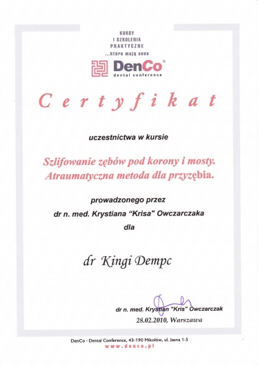 Leczyłem u Pani Kingi kilka ubytków i naprawdę żałuję, że nie było ich więcej. Pani Kinga Kołacka to specjalista jakich mało. Jako pierwsza ze wszystkich dentystów, zastosowała idealne rozwiązanie moich problemów związanych z krztuszeniem się wodą z wiertła. Wizyty u dentysty przestały być koszmarem. Pięknie wykonane wypełnienia ubytków, opieka od A-Z i przemiła atmosfera.