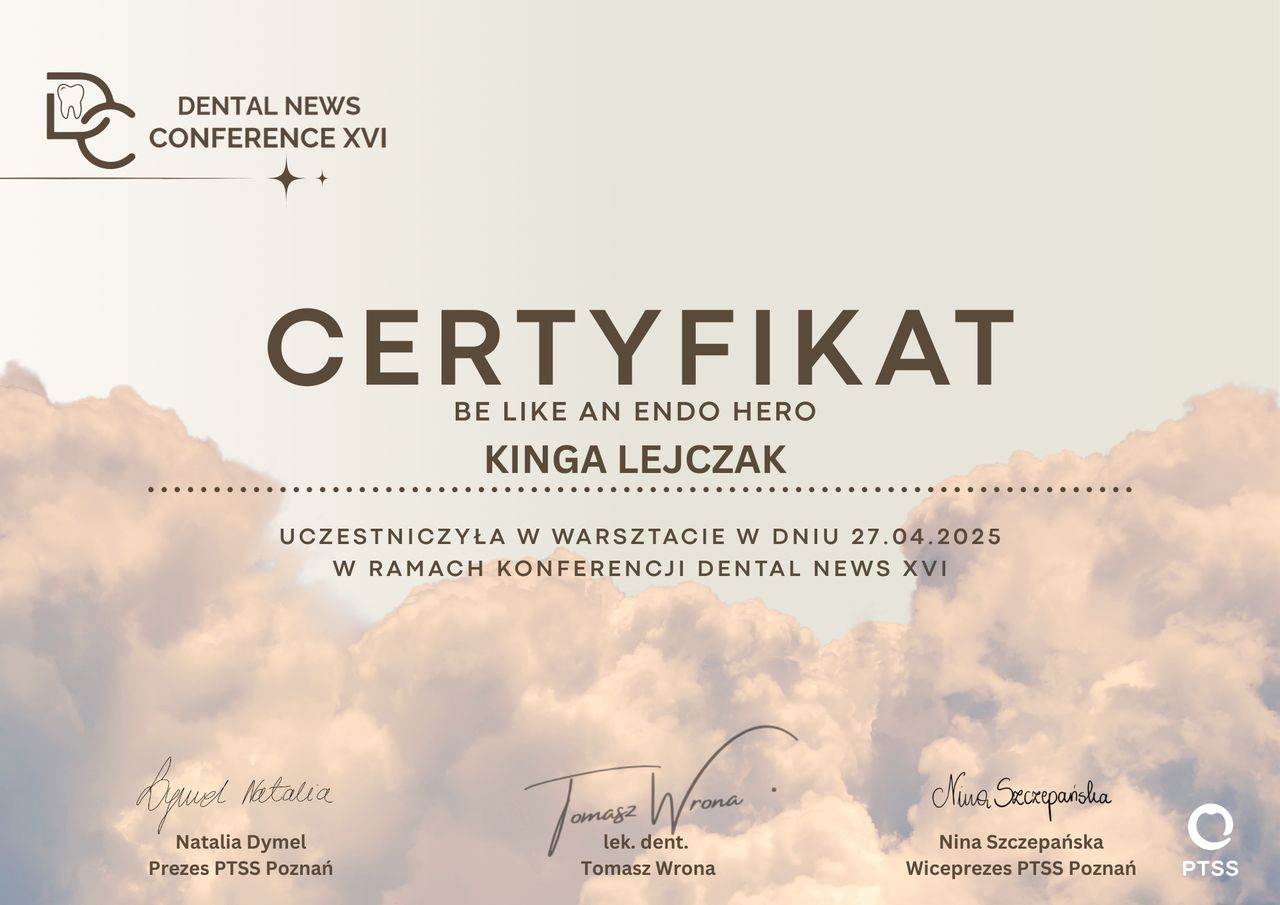 Systematycznie poszerzam swoją wiedzę poprzez uczestnictwo w szkoleniach i konferencjach, by oferować moim pacjentom skuteczne i zgodne z wytycznymi metody leczenia.