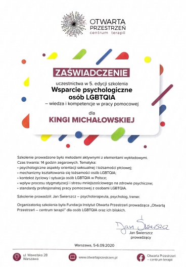 Możliwe formy terapii: w gabinecie, on-line, mieszane (np. on-line, raz w miesiącu w gabinecie).
