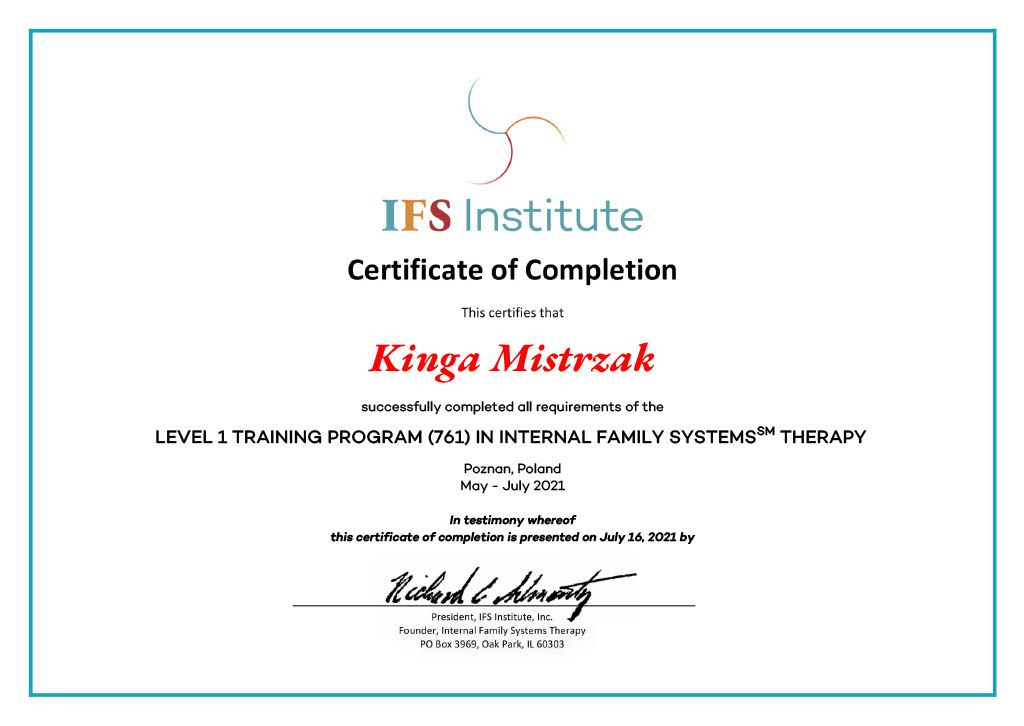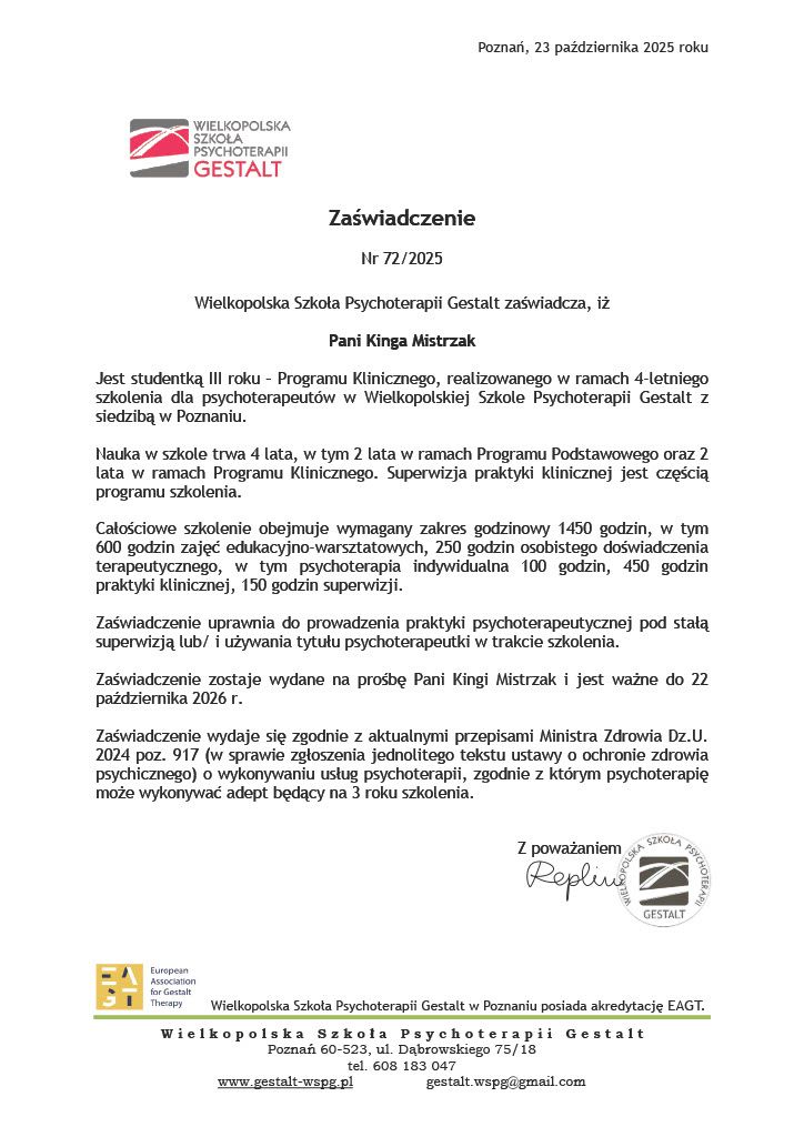 Jestem psychoterapeutką Gestalt w trakcie szkolenia, obecnie na trzecim roku Wielkopolskiej Szkoły Psychoterapii Gestalt w Poznaniu. W pracy psychoterapeutycznej wspieram się także modelem Systemu Wewnętrznej Rodziny (IFS – Internal Family System). Ukończyłam szkolenie IFS Level 1. Bliskie jest mi również Porozumienie bez przemocy (NVC – Nonviolent Communication).