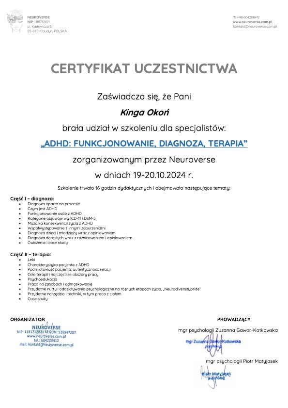 Jaki jest zakres porad oferowanych przez Kinga Okoń?Kinga Okoń to psycholog. Na podstawie swojego doświadczenia i wykształcenia Kinga Okoń oferuje usługi takie jak: konsultacja psychologiczna (pierwsza wizyta), Konsultacja psychologiczna, Diagnoza ADHD, konsultacja psychoterapeutyczna.