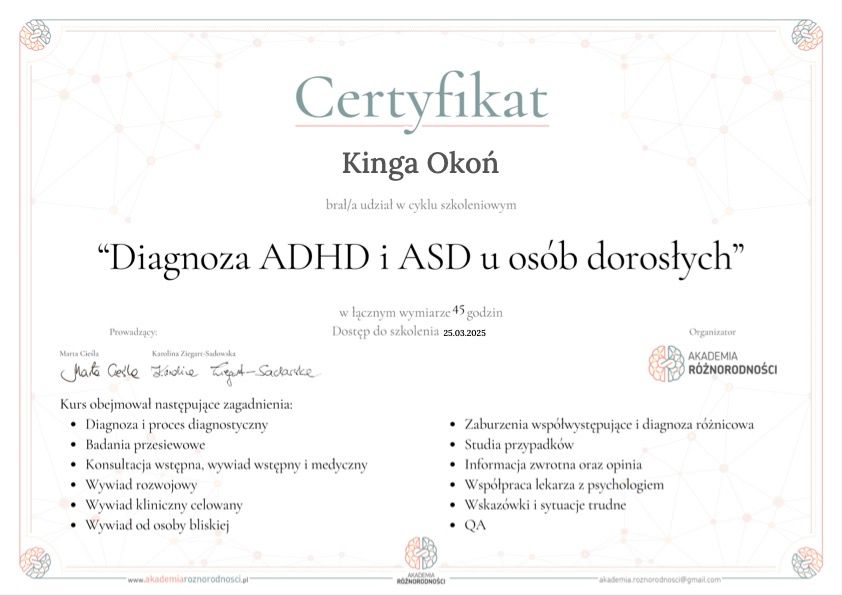 Do pani Kingi trafiłam w celu diagnozy w kierunku ADHD. W gabinecie czułam się zaopiekowana i bezpieczna. Od początku do końca wiedziałam co robimy i w jakim celu. Dostałam dużo informacji jak postępować dalej, po diagnozie nie zostałam z tym sama. Bardzo polecam to miejsce!