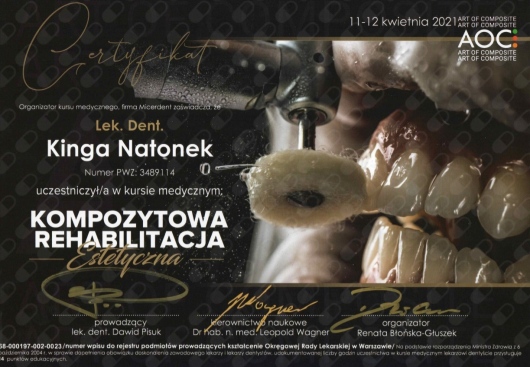 W codziennej praktyce każdy zabieg przeprowadzam pod mikroskopem, głownie zajmuję się leczeniem kanałowym pod mikroskopem oraz odbudową zachowawczą lub protetyczną po leczeniu. W 2020 ukończyłam Curriculum Endodontyczne i jestem członkinią Polskiego Towarzystwa Endodontycznego (PTE) oraz European Society of Endodontology (ESE).
