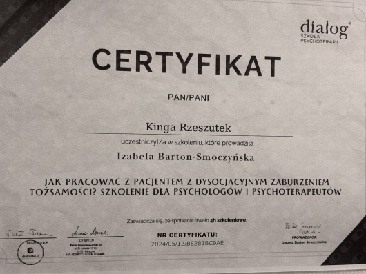 Gorąco polecam wizyty u Kingi Rzeszutek! To osoba niezwykle empatyczna, ciepła i profesjonalna. Już od pierwszego spotkania czułem się w pełni zaopiekowany i wysłuchany. Dzięki wspólnej pracy udało mi się lepiej zrozumieć swoje emocje i znaleźć rozwiązania dla problemów, z którymi wcześniej nie mogłem sobie poradzić. Każda wizyta przebiega w miłej, bezpiecznej atmosferze, a podejście Pani Kingi daje poczucie, że nie ma złych pytań ani wątpliwości, których nie można omówić. Z całego serca polecam wszystkim, którzy szukają wsparcia i chcą lepiej zadbać o swoje zdrowie psychiczne