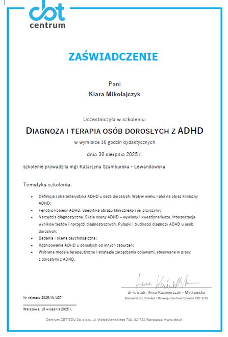 Uważam, że każdy ma w sobie potencjał do zmiany – a moim celem jest towarzyszenie w tej zmianie w sposób konkretny, zrozumiały i oparty na relacji. Pracuję w języku polskim i angielskim, stacjonarnie, z osobami dorosłymi oraz z młodymi dorosłymi (16+), które chcą lepiej zrozumieć siebie.