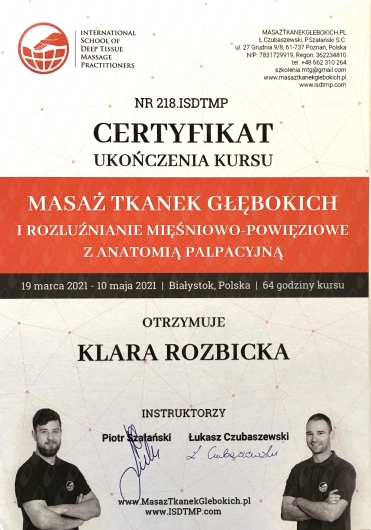 - Masaż Tkanek Głębokich i rozluźnianie mięśniowo-powięziowe z anatomią palpacyjną DTMP Certification Program - Nr 218.ISDTMP