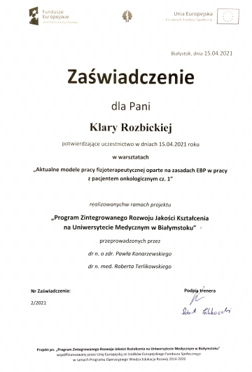 - warsztaty „Aktualne modele pracy fizjoterapeutycznej oparte na zasadach EBP w pracy z pacjentem onkologicznym”