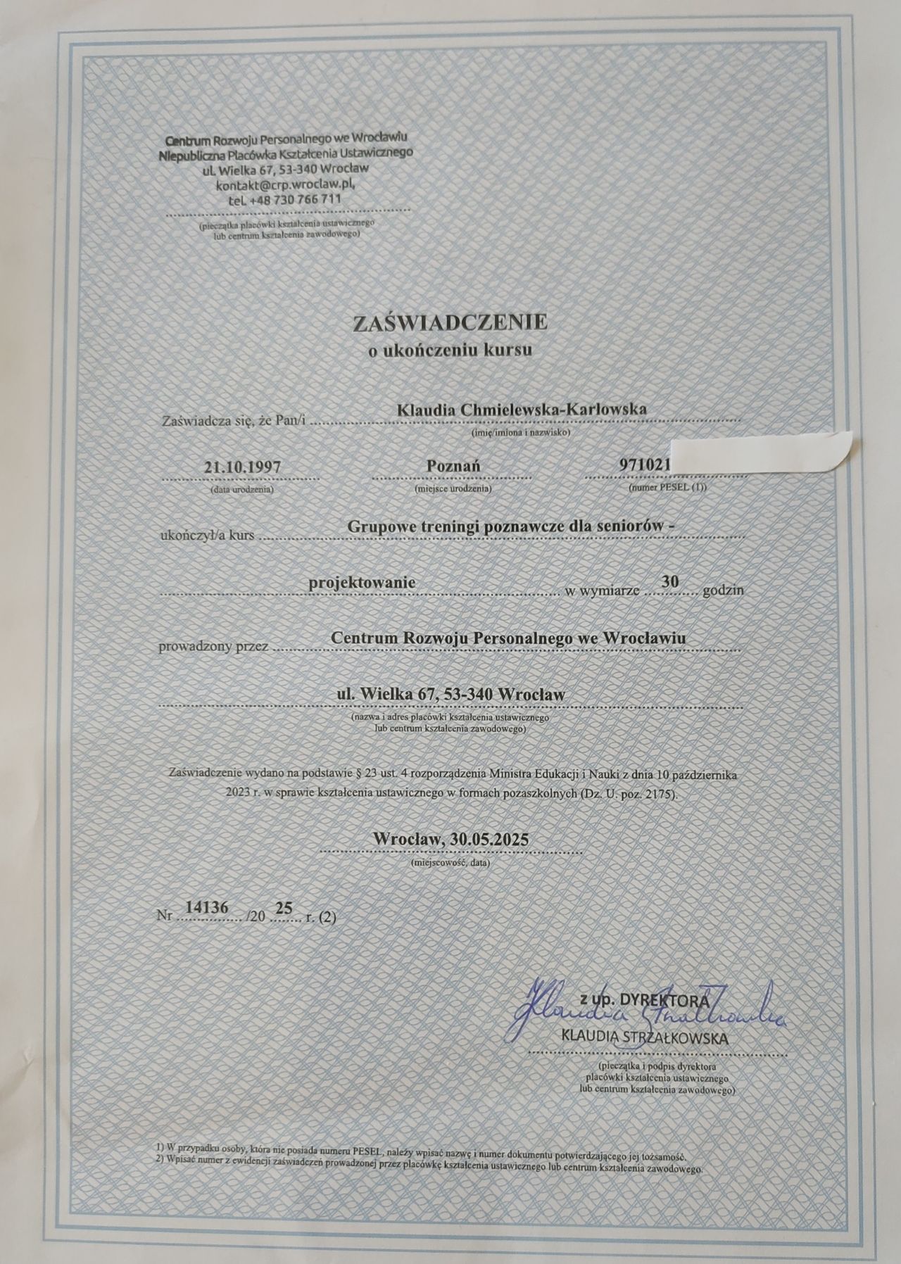 Bardzo polecam psychologa Klaudię Chmielewska-Karlowska to wyjątkowo empatyczna, uważana i profesjonalna psycholog. Już od pierwszego spotkania czułam się wysłuchana i zrozumiana. Spotkanie przebiegło w bezpiecznej, komfortowej atmosferze, co bardzo pomogło otworzyć się i pracować nad sobą. Dzięki terapii udało mi się lepiej zrozumieć swoje emocje i poradzić sobie z trudnościami, które wcześniej wydawały się nie do przejścia . Serdecznie dziękuję i z pełnym przekonaniem polecam każdemu, kto szuka prawdziwego wsparcia.