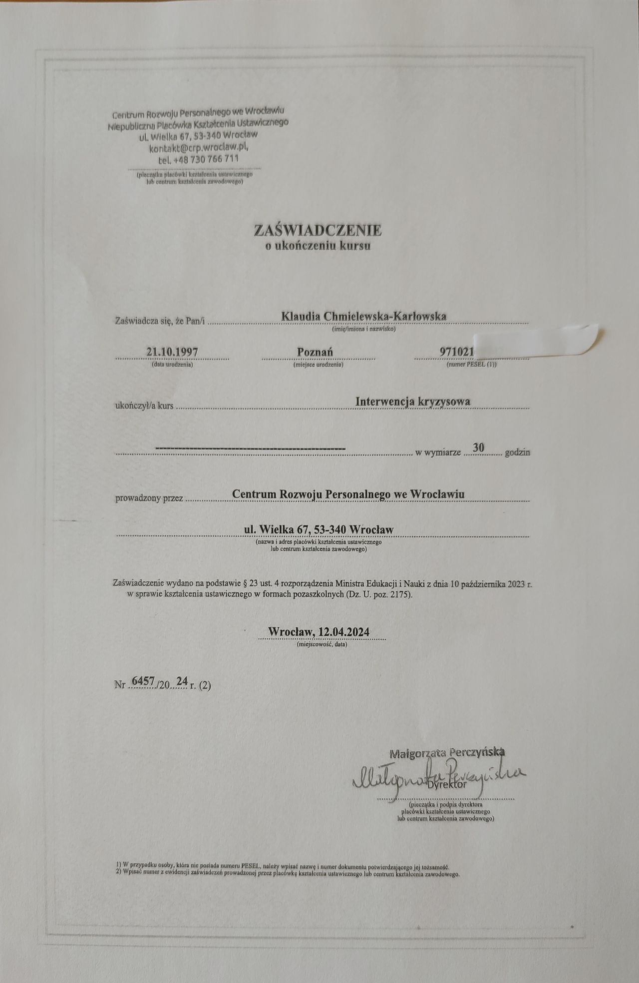 Zdobyłam tytuł magistra psychologii na Uniwersytecie SWPS (specjalność - psychologia kliniczna). Ukończyłam również kurs Interwencji Kryzysowej w Centrum Rozwoju Personalnego we Wrocławiu.