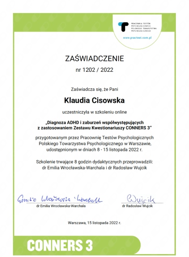 Jaki jest zakres porad oferowanych przez Klaudia Cisowska?Klaudia Cisowska to psycholog, psychoterapeuta. Na podstawie swojego doświadczenia i wykształcenia Klaudia Cisowska oferuje usługi takie jak: konsultacja psychologiczna (pierwsza wizyta), diagnoza ADHD dla dorosłych, konsultacja online.