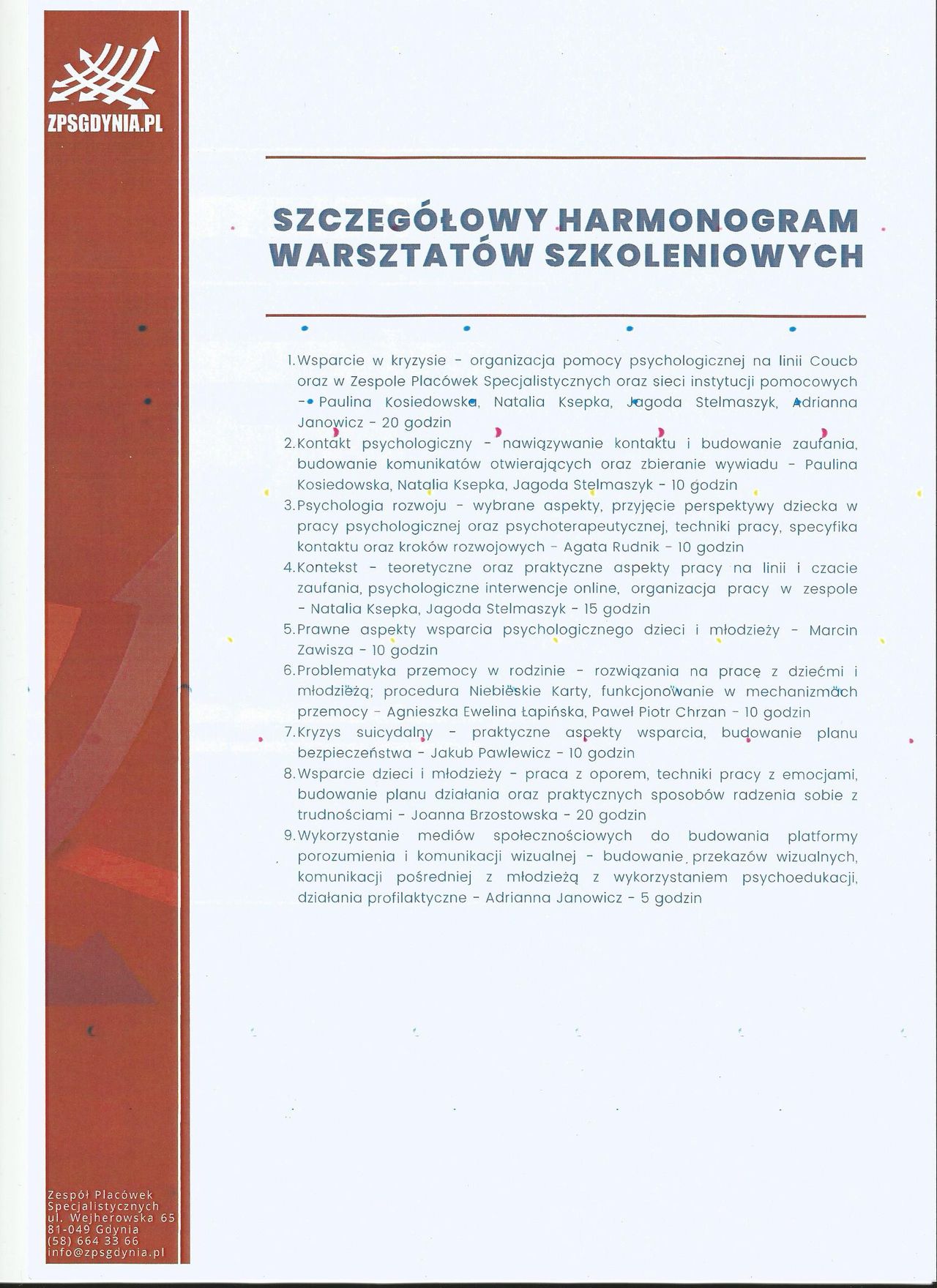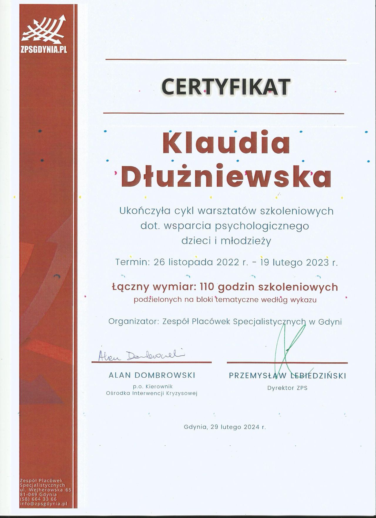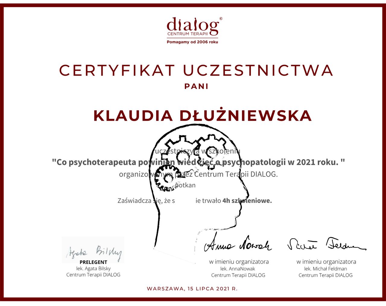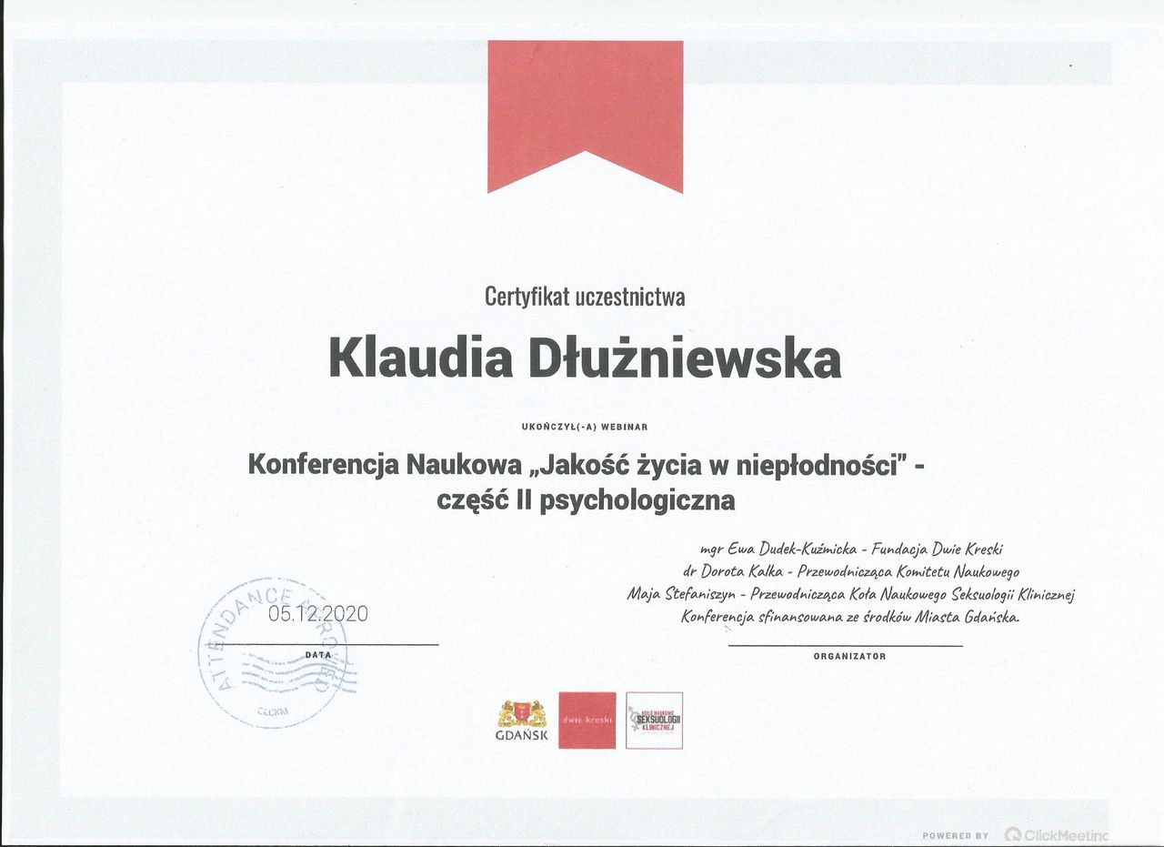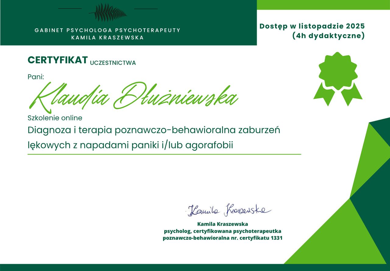 Staram się dbać o regularne podnoszenie swoich kompetencji poprzez udział w licznych szkoleniach z zakresu zdrowia psychicznego.