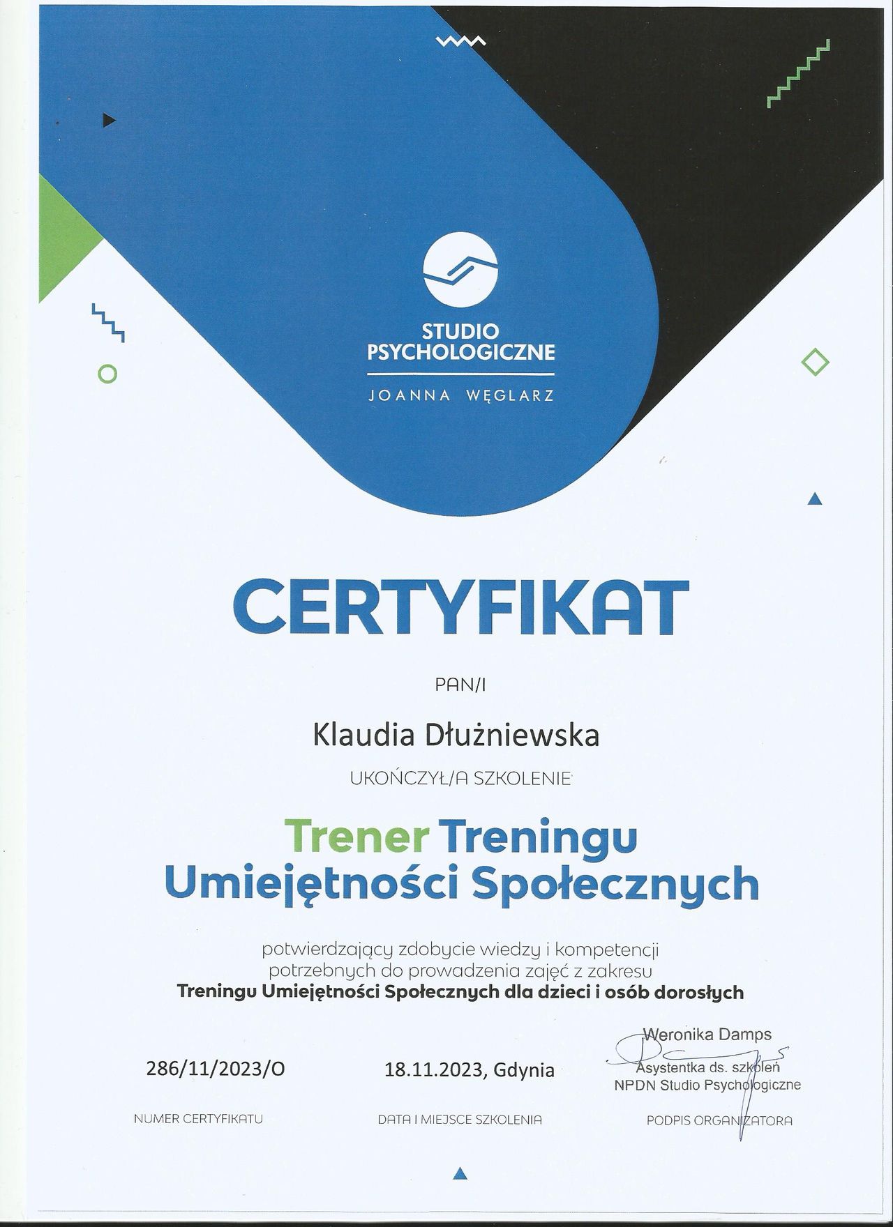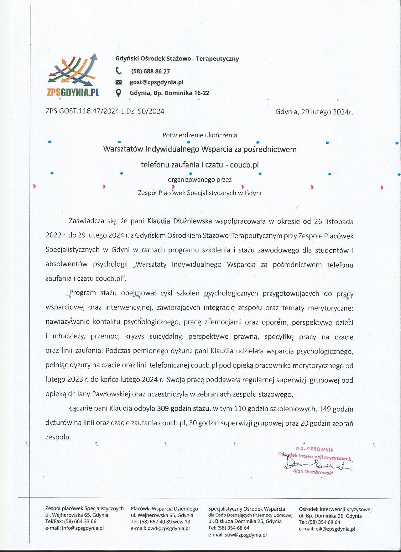 Jestem psycholożką (Uniwersytet SWPS w Sopocie; specjalność: Psychologia Kliniczna) w trakcie 4-letniego całościowego szkolenia psychoterapeutycznego w nurcie poznawczo-behawioralnym (Szkoła Psychoterapii Crescentia). Doświadczenie zawodowe zdobywałam między innymi odbywając praktyki na Oddziale Dziennym Psychogeriatrycznym, w Placówce Wsparcia Dziennego oraz w Zespole Szkół nr 3 w Gdyni. Ukończyłam 1,5-roczny staż na infolinii i czacie zaufania dla dzieci, młodzieży i młodych dorosłych. Po tym czasie objęłam funkcję koordynatorki linii zaufania i od ponad 2 lat wspomagam klientów w kryzysach psychicznych. W ramach swojej pracy dodatkowo pełnię opiekę merytoryczną nad stażem dla studentów psychologii i psychologów oraz prowadzę warsztaty z zakresu pomocy psychologicznej i interwencji kryzysowej. Ukończyłam również studia podyplomowe z przygotowania pedagogicznego dla psychologów oraz jestem trenerem TUS. Moją pracę poddaję regularnej superwizji. Jestem członkinią Polskiego Towarzystwa Terapii Poznawczo-Behawioralnej (PTTPB).
