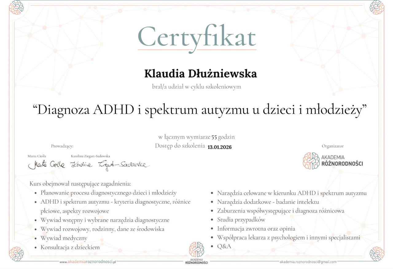 Czy Klaudia Dłużniewska przyjmuje online, bez konieczności pojawiania się w placówce?Tak, Klaudia Dłużniewska oferuje konsultacje online. Wybierz opcję „konsultacja online” przy umawianiu wizyty, a zobaczysz dostępne terminy.
