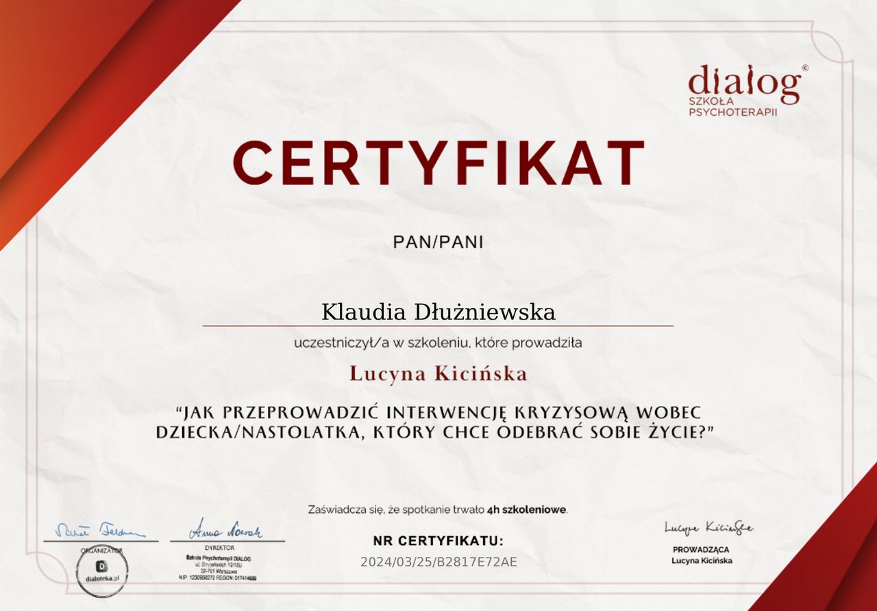 Jaki jest zakres porad oferowanych przez Klaudia Dłużniewska?Klaudia Dłużniewska to psycholog. Na podstawie swojego doświadczenia i wykształcenia Klaudia Dłużniewska oferuje usługi takie jak: interwencja kryzysowa, Konsultacja psychologiczna, konsultacja psychoonkologiczna, konsultacja psychologiczna (pierwsza wizyta), Konsultacja psychologiczna online, konsultacja psychologiczna młodzieży, Terapia psychologiczna, Pakiet premium, Pakiet starter, Sesja psychologiczna.
