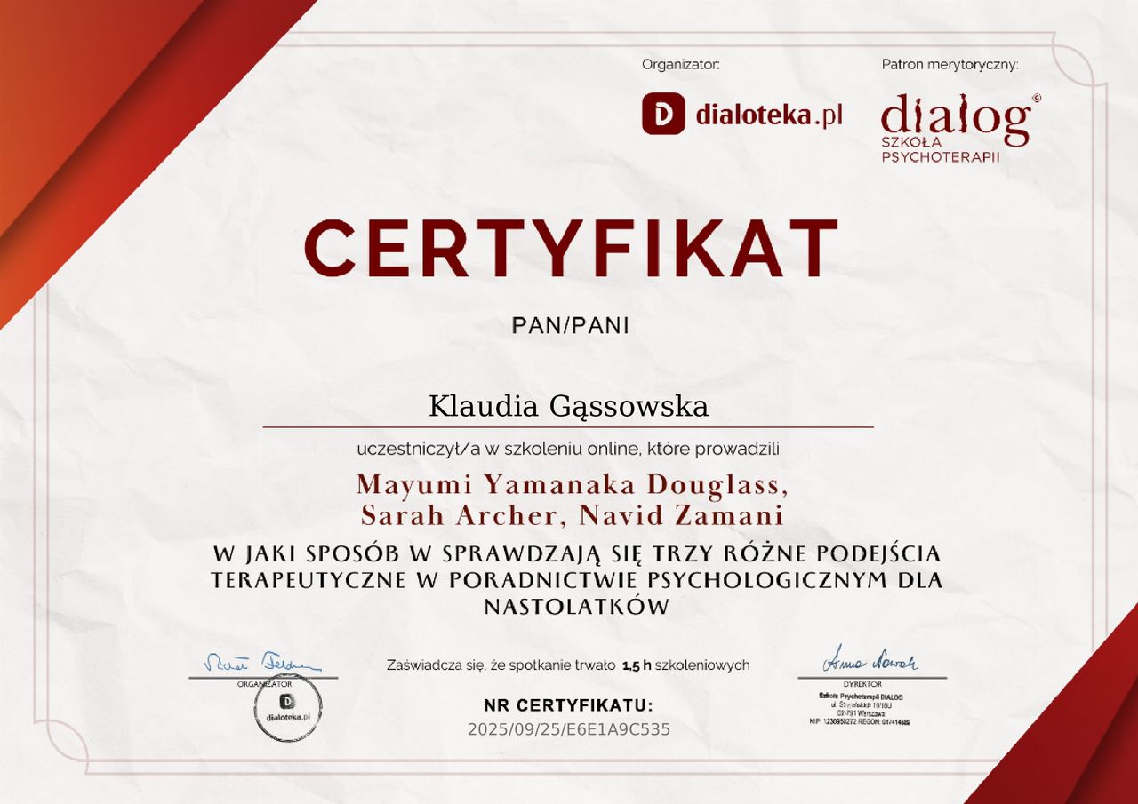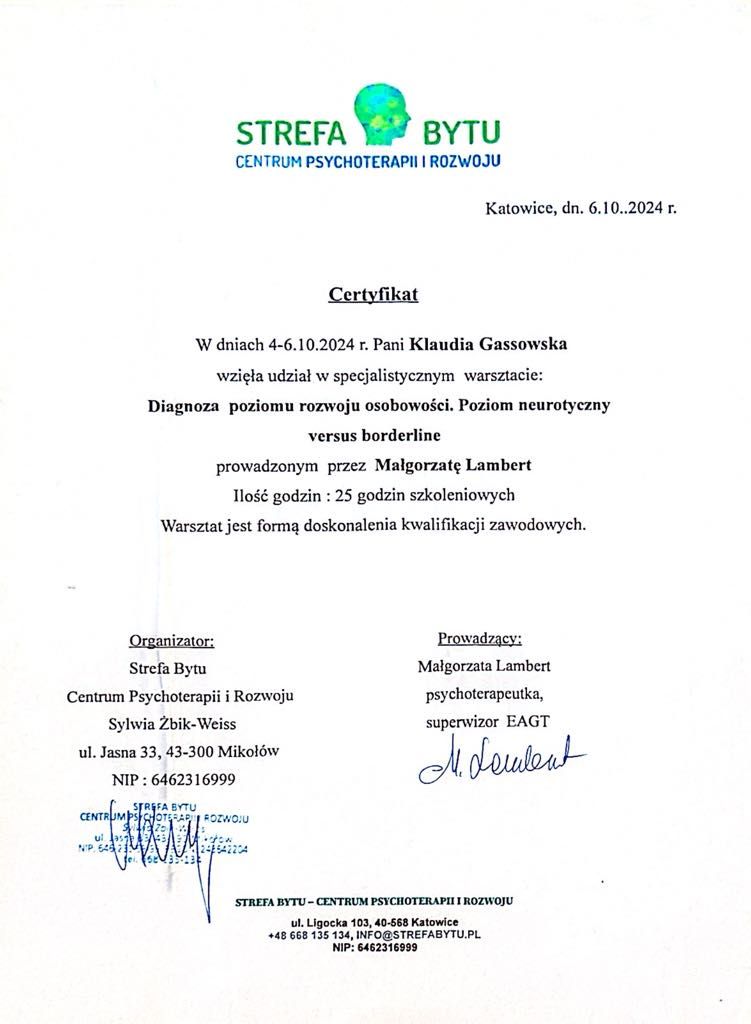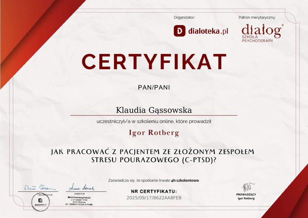 Z Panią Gąssowską współpracuję od kilku miesięcy. Od pierwszych sesji jasne było, że jest to osoba niezwykle profesjonalna, empatyczna i zaangażowana w proces terapeutyczny. Podczas spotkań czuję się wysłuchana (bez poczucia bycia ocenianą), co pozwala mi na otwartość i szczerość w omawianiu trudnych tematów. Psychoterapeutka potrafi stworzyć bezpieczną przestrzeń, w której mogę swobodnie dzielić się swoimi myślami i emocjami. Każde spotkanie przynosi nowe spostrzeżenia i pomaga mi lepiej radzić sobie z wyzwaniami. Szczególnie cenię sobie to że Pani Klaudia szczerze się stara i nie podchodzi do spotkań jak do przykrej rutyny (z czym spotkałam się u innych terapeutów). Nareszcie trafiłam na terapeutkę której pomoc realnie odczuwam. Z pełnym przekonaniem polecam współpracę z Panią Klaudią, ponieważ jest to po prostu wspaniała osoba.