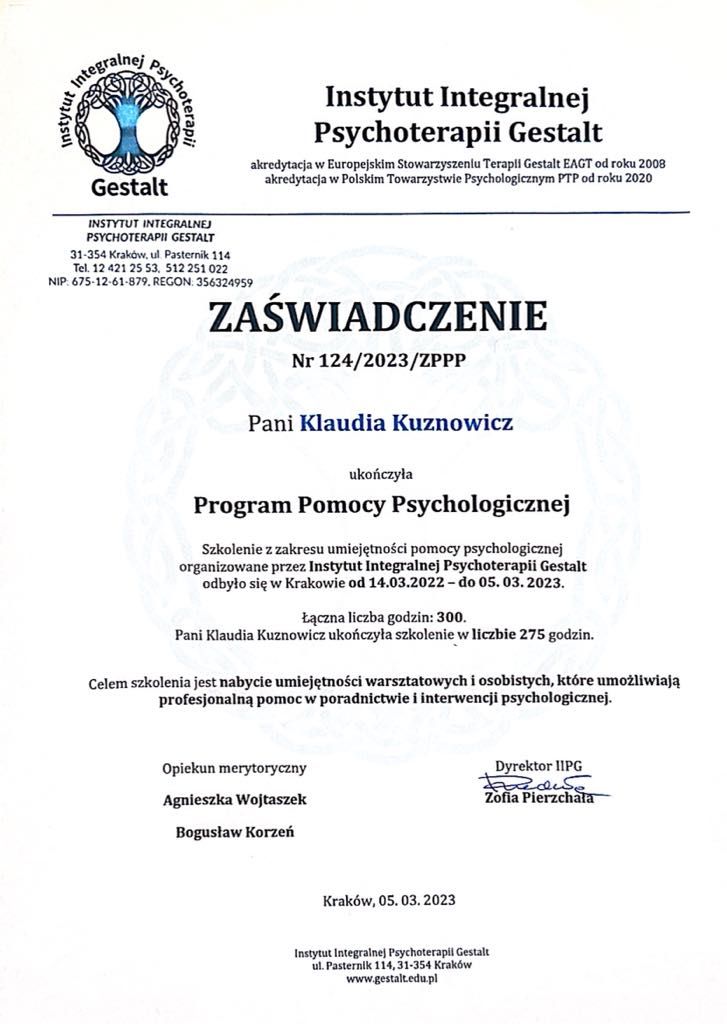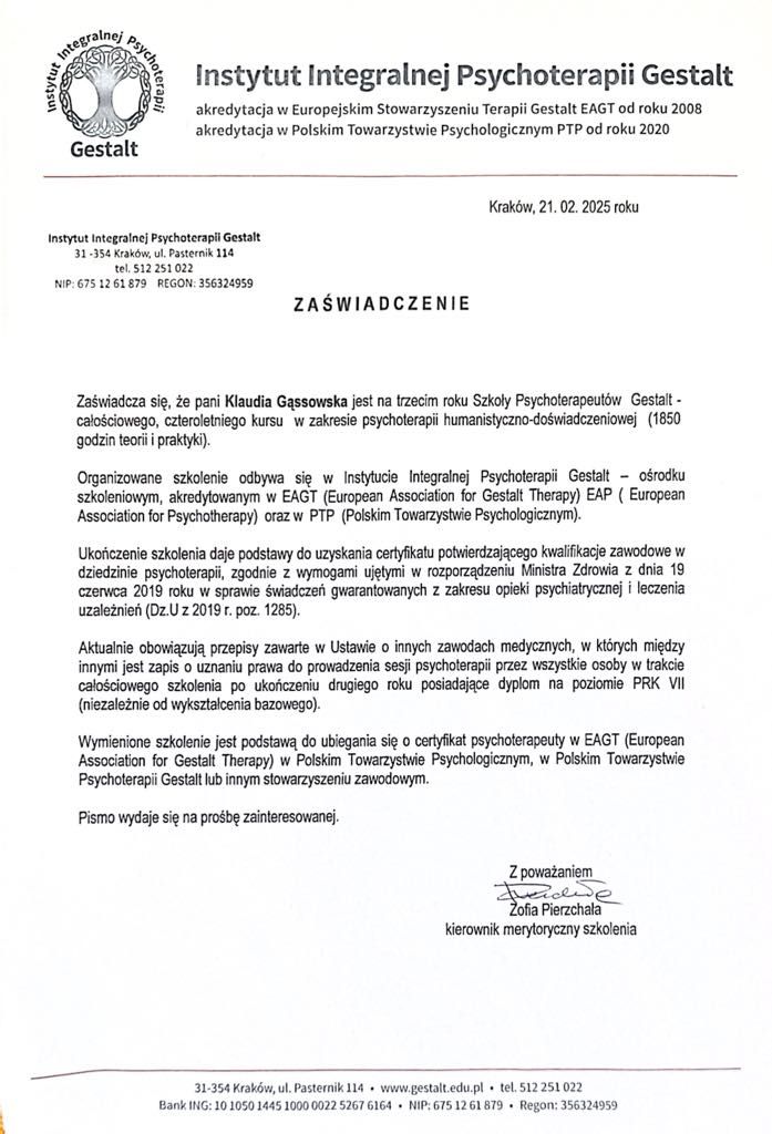 Jestem psychoterapeutką w trakcie szkolenia w Instytucie Integralnej Psychoterapii Gestalt w Krakowie, akredytowanym przez EAGT i PTPG. W swojej pracy stosuję podejście Gestalt, które pozwala na integrację wszystkich aspektów osobowości — myśli, emocji i ciała. Regularnie podnoszę swoje kompetencje, uczestnicząc w szkoleniach oraz studiując literaturę fachową. Moją pracę poddaję regularnej superwizji. Doświadczenie zdobywałam m.in. podczas stażu w Szpitalu Wojskowym w Krakowie oraz pracując z młodymi dorosłymi w stowarzyszeniu MONAR we Wrocławiu.