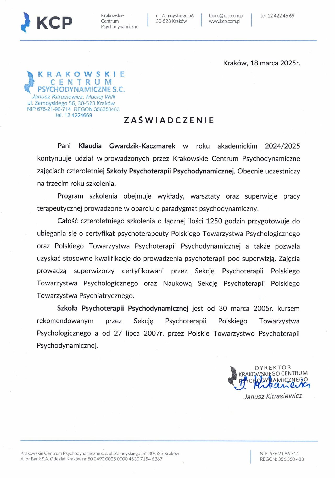 Pragnąc uzupełnić swoje wykształcenie rozpoczęłam naukę w Krakowskim Centrum Psychodynamicznym. Wybór szkoły terapeutycznej był podyktowany moją chęcią dotarcia do jak najszerszej grupy pacjentów, wykazujących najróżniejsze postaci problemów. W swojej pracy stawiam na profesjonalizm - staram się jak najskuteczniej wykorzystywać metodę opartą na relacji terapeutycznej (z obiektem), przy zachowaniu maksimum empatii i zrozumienia dla przeżyć konkretnego pacjenta. Wierzę, że przy ukierunkowanym wysiłku ze strony terapeuty i pacjenta każda, pożądana zmiana może pozostać trwała.