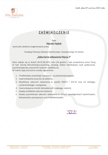Dodatkowo odbyłam szkolenie z profilaktyki oraz terapii zaburzeń odżywiania, prowadzone przez dr. Dorotę Mroczkowską.