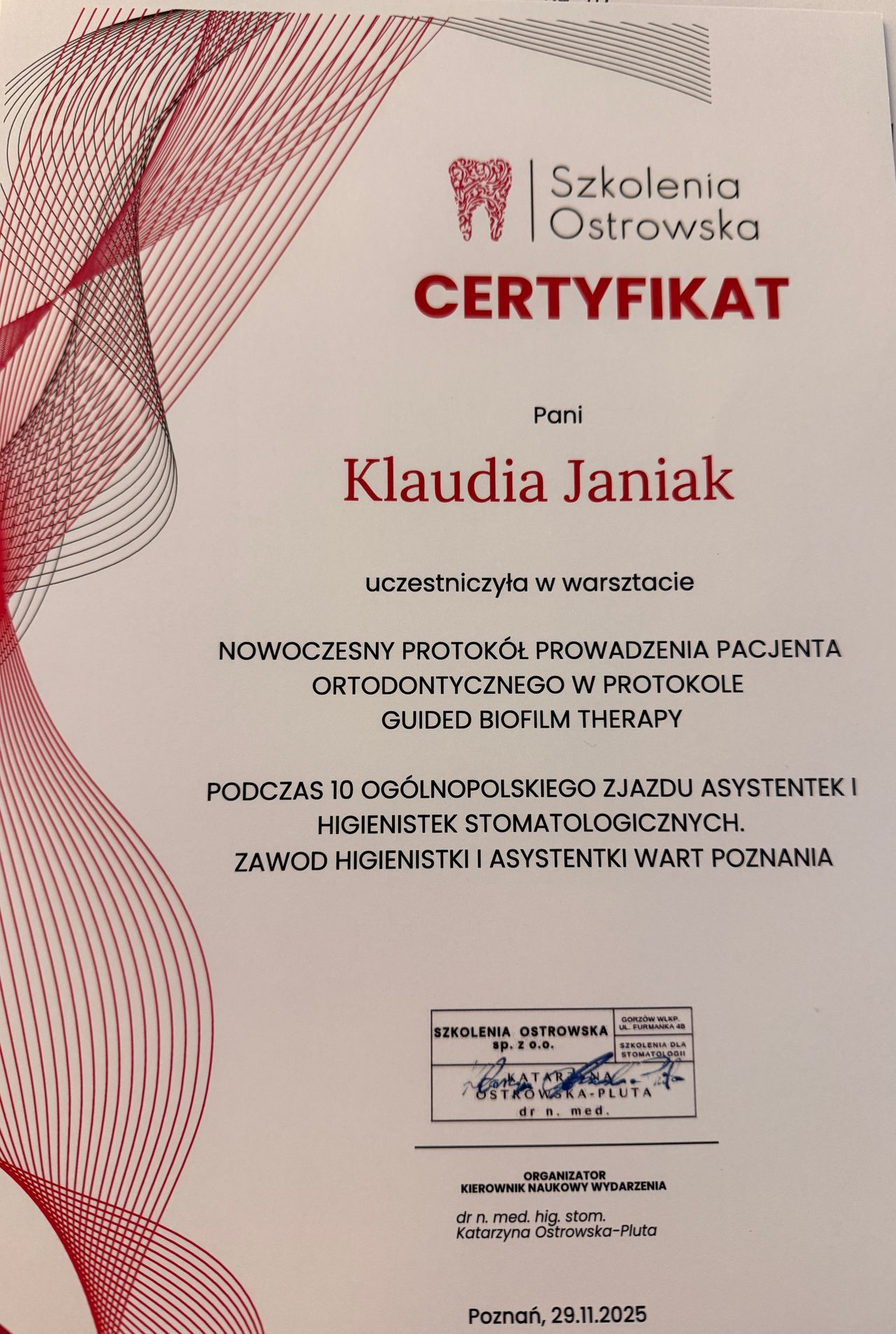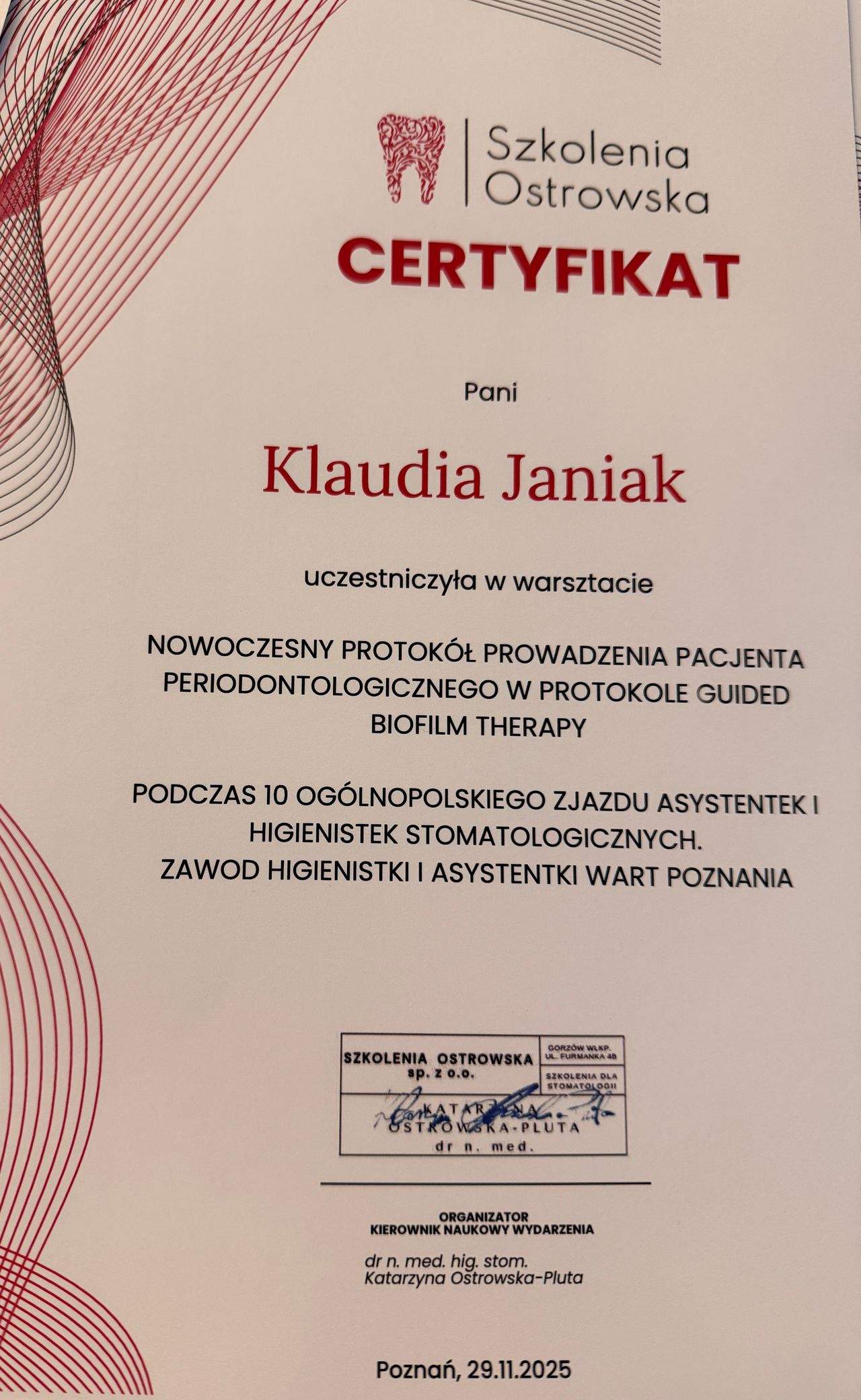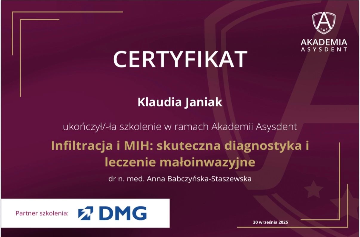 Regularnie uczestniczę w kursach i szkoleniach, by stale rozwijać swoje umiejętności i pracować zgodnie z najnowszymi standardami profilaktyki stomatologicznej.