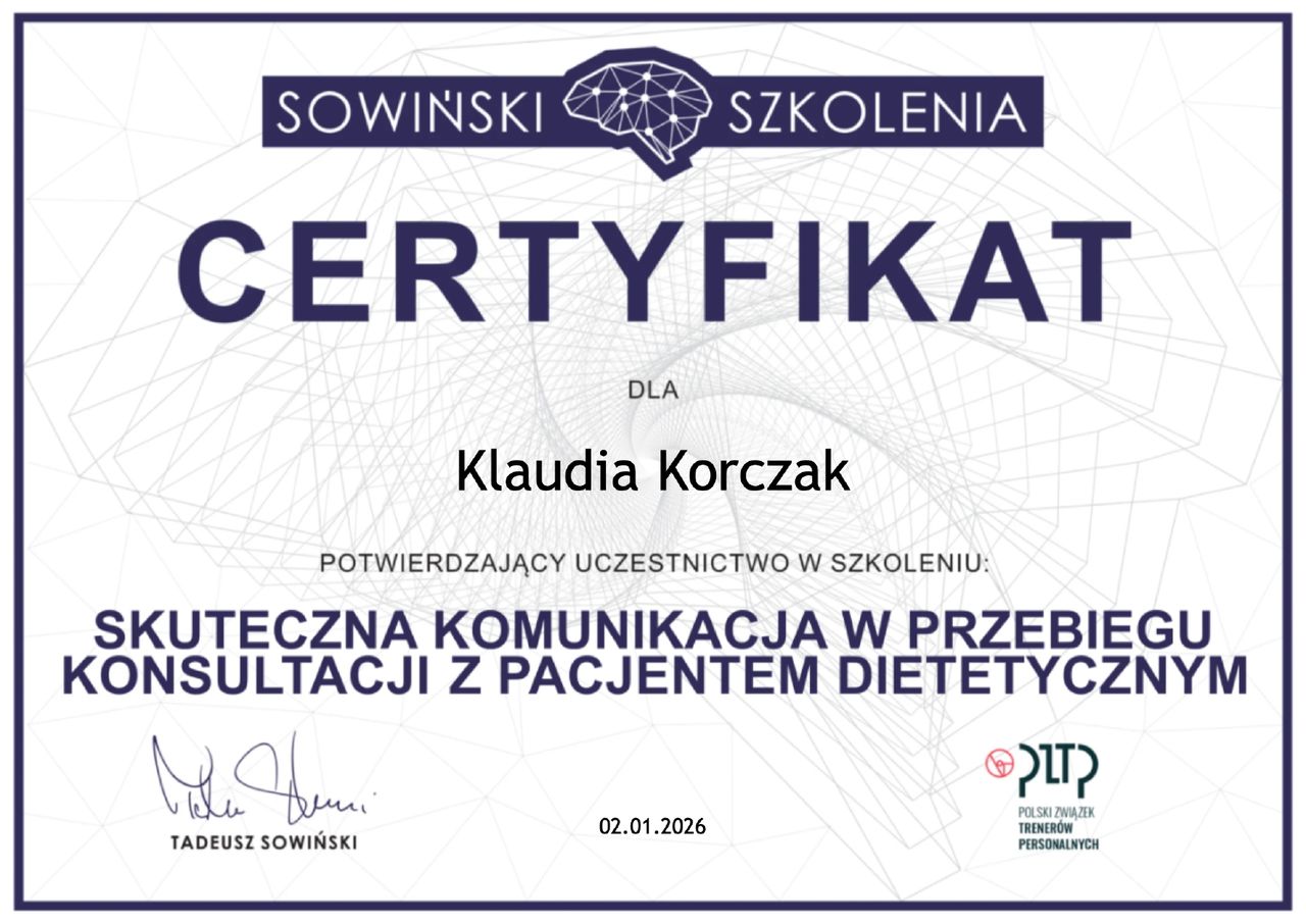 Moim celem jest poprawa jakości życia pacjenta, lepsze samopoczucie na co dzień oraz budowanie świadomości żywieniowej, która pozwala podejmować zdrowe decyzje również po zakończeniu współpracy.
